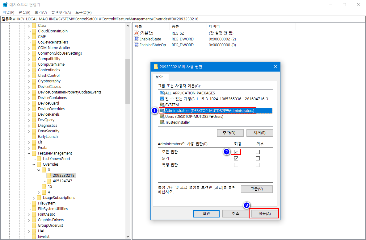 - 이렇게 소유자 권한 이전과 권한 부여를 가능하게 만들었으니, 다시 '모든 권한 → 허용'을 체크하여 레지스트리를 수정할 수 있게 합니다.