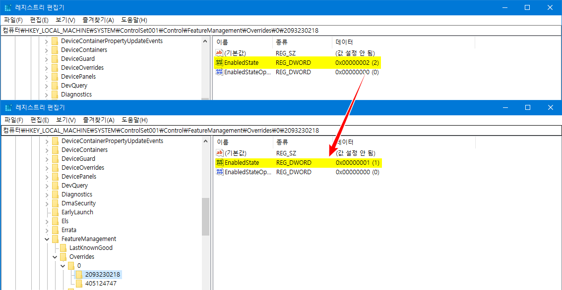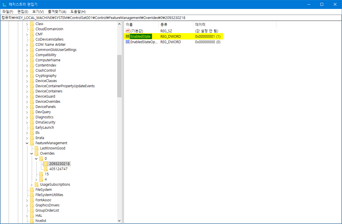 - '2093230218' 키에 2 가지 레지스트리 값이 있는데, 저희들이 수정할 레지스트리 값은 'EnabledState' 입니다. 'EnabledState 레지스트리 값을 더블 클릭하여, 데이터 '2' 부분을 '1'로 수정하면 '클래식 시스템 속성'으로 변경하면 됩니다.