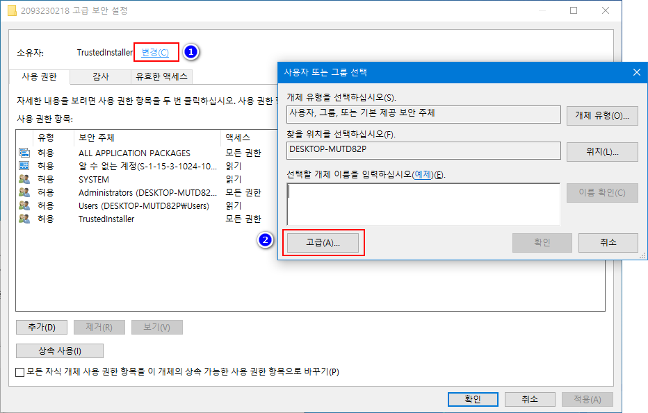 - 이 과정은 소유권 이전과 권한 부여 과정입니다. 고급 보안 설정 창에서 상단에 있는 '소유자 Trustedinstaller(최고 관리자 권한)' '변경'을 클릭한 다음