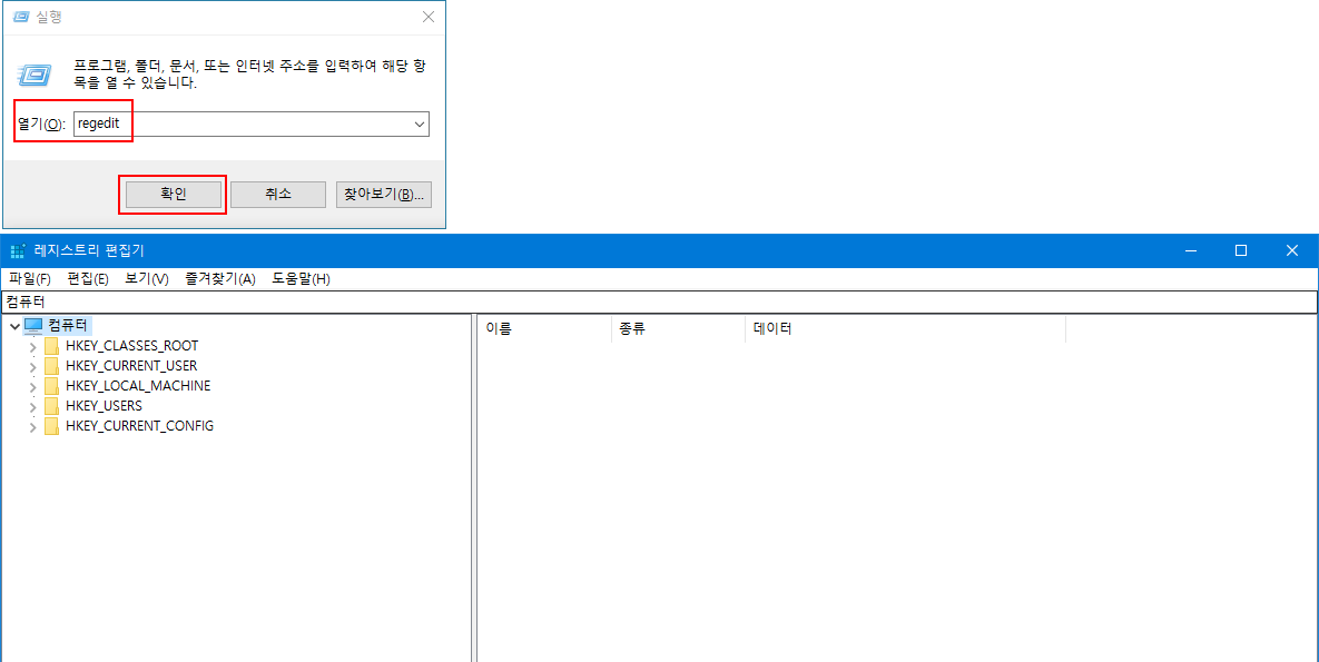 - 열기 부분에 'regedit'를 입력하여 레지스트리 편집기를 실행합니다.