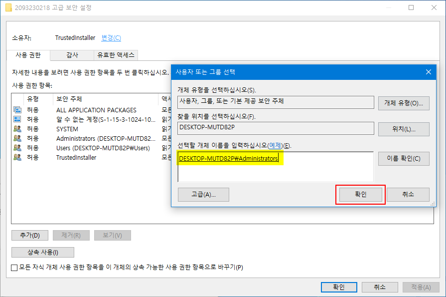 - 소유자(본인이 사용하는 윈도우따라 이름이 다릅니다)가 'DESKTOP-MUTD82P\Administrators'로 변경되었음을 알수 있습니다. 이상이 없으면 확인 버튼을 누룹니다.
