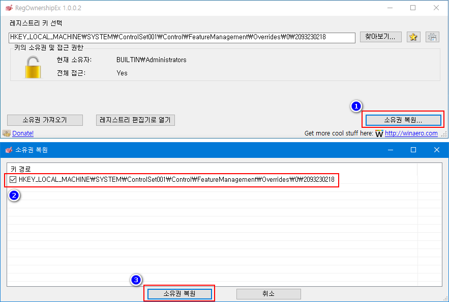 - 더 이상 레지스트리를 작업할 부분이 없으면 '소유권 복원'을 선택하여 Windows 기본으로 다시 복구합니다.