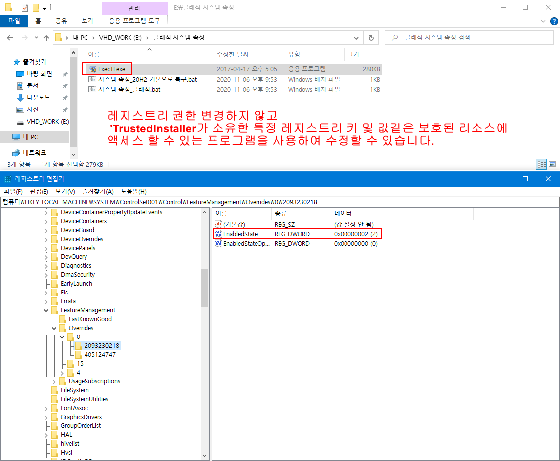 - '2093230218 키 → EnabledState 레지스트리 값을 더블 클릭 → 값 데이터 2 → 값 데이터 1로 수정'하면 저희들이 드디어 원하는 '클래식 시스템 속성'으로 변경됩니다.
