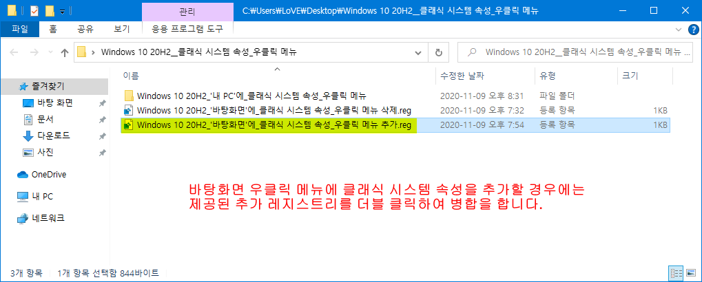 바탕화면 우클릭 메뉴의 레지스트리는 사용 권한이 없어도 수정이 가능한 부분입니다. 따라서 제공된 자료를 다운 받으시고, 해당 레지스트리 파일(Windows 10 20H2_'바탕화면'에_클래식 시스템 속성_우클릭 메뉴 추가.reg)을 더블 클릭하여 병합시켜 주시면 됩니다.