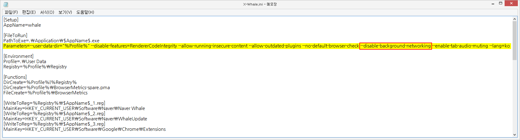 2 가지 포터블 버전에서 '확장 앱'의 자동 업데이트를 사용하고자 할 경우에는 다운로드한 압축파일을 압축 해제하고, 사용할 64비트 또는 32비트 폴더에서 아래와 같은 파일을 메모장으로 열어서 추가된 매개변수(Parameters 또는 Parames) 중에 '--disable-background-networking' 값을 삭제하시면 '확장 앱'이 자동으로 업데이트됩니다.