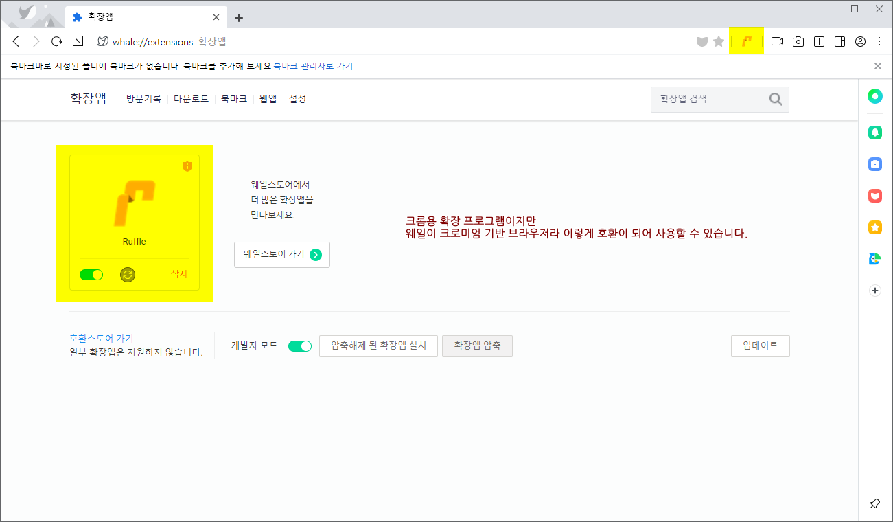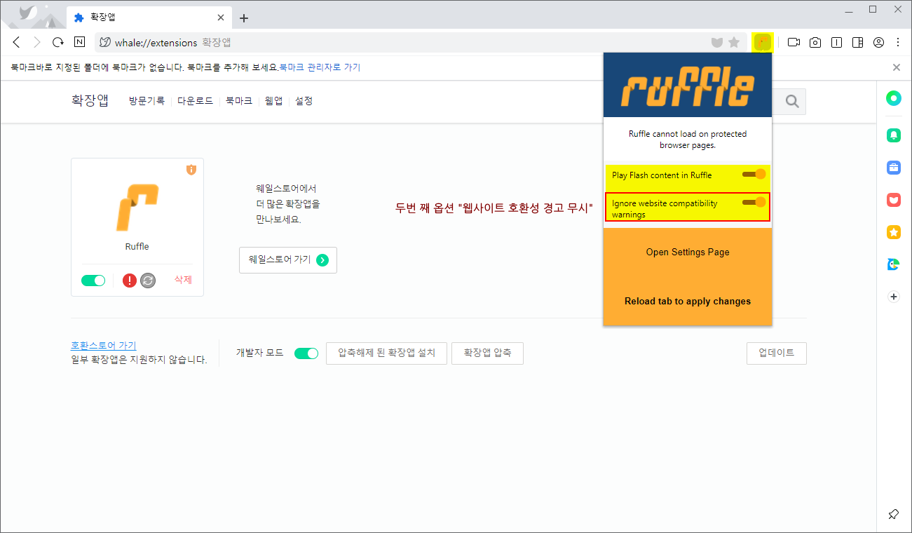 확장 프로그램인 ruffle 다운로드 공식 사이트(플래시 확장앱)에서 최신 버전을 다운로드한 다음, 아래 캡처 이미지를 참고하여 사용하시면 됩니다.