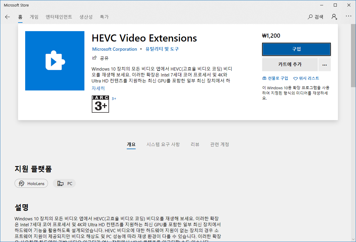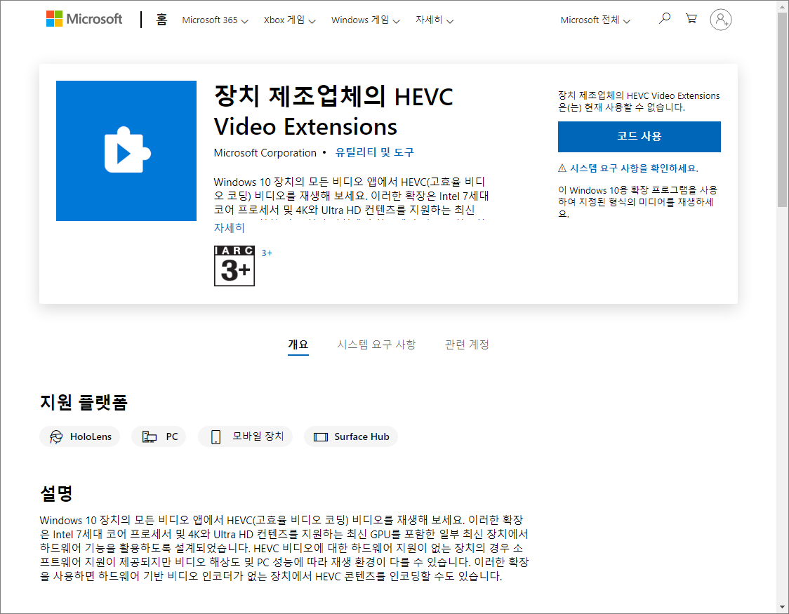 | www.microsoft.com/ko-kr/p/hevc-video-extensions-from-device-manufacturer/9n4wgh0z6vhq?activetab=pivot:overviewtab |