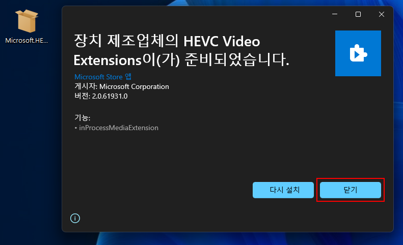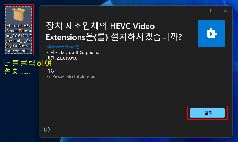 스크립트 파일을 이용하지 않고 'Microsoft.HEVCVideoExtension_2.1.1161.0_neutral_~_8wekyb3d8bbwe.AppxBundle' 파일을 이용하실려면....