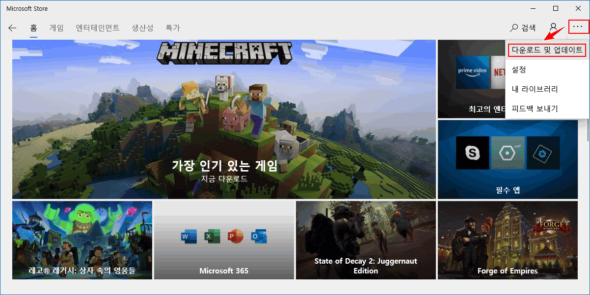 'Microsoft Store'를 실행한 후, 오른쪽 상단에 있는 '간단 표시(•••)'를 선택하고 '다운로드 및 업데이트' 메뉴를 클릭합니다.