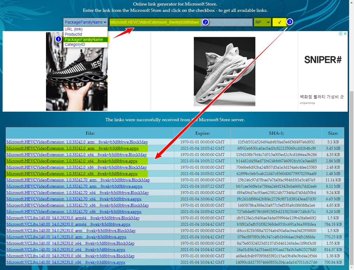 위에 링크 주소를 클릭하여 rgadguard 사이트에 접속합니다. 다운로드 방법이 조금 생소하지만 검색 부분에 'Package Family Name'인 'Microsoft.HEVCVideoExtension_8wekyb3d8bbwe' 이름을 입력하여 다운로드하면 됩니다. HEVC 코덱의 버전에 따라 검색되는 부분이 다들 수 있습니다.