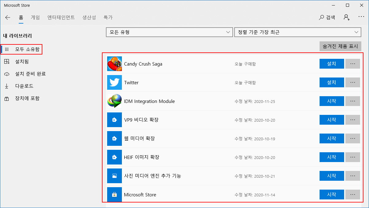 '다운로드 및 업데이트' 메뉴를 클릭하면 왼쪽에 여러 항목이 나열되는데, 그 중에 '모두 소유함' 항목을 클릭하여 사용중인 Windows 10에 설치된 앱과 확장 기능들을 확인합니다.