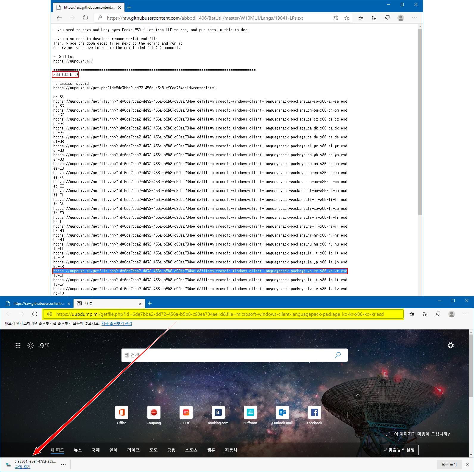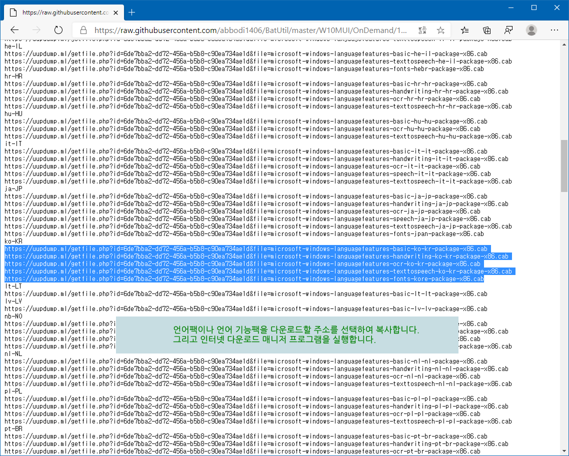 - 다운로드할 Windows 10 x86(32비트) / 64(64비트) 목록에서 언어팩 다운로드 링크 주소를 복사하여, 브라우저 주소에 붙여넣기한 다음 다운로드하면 됩니다.