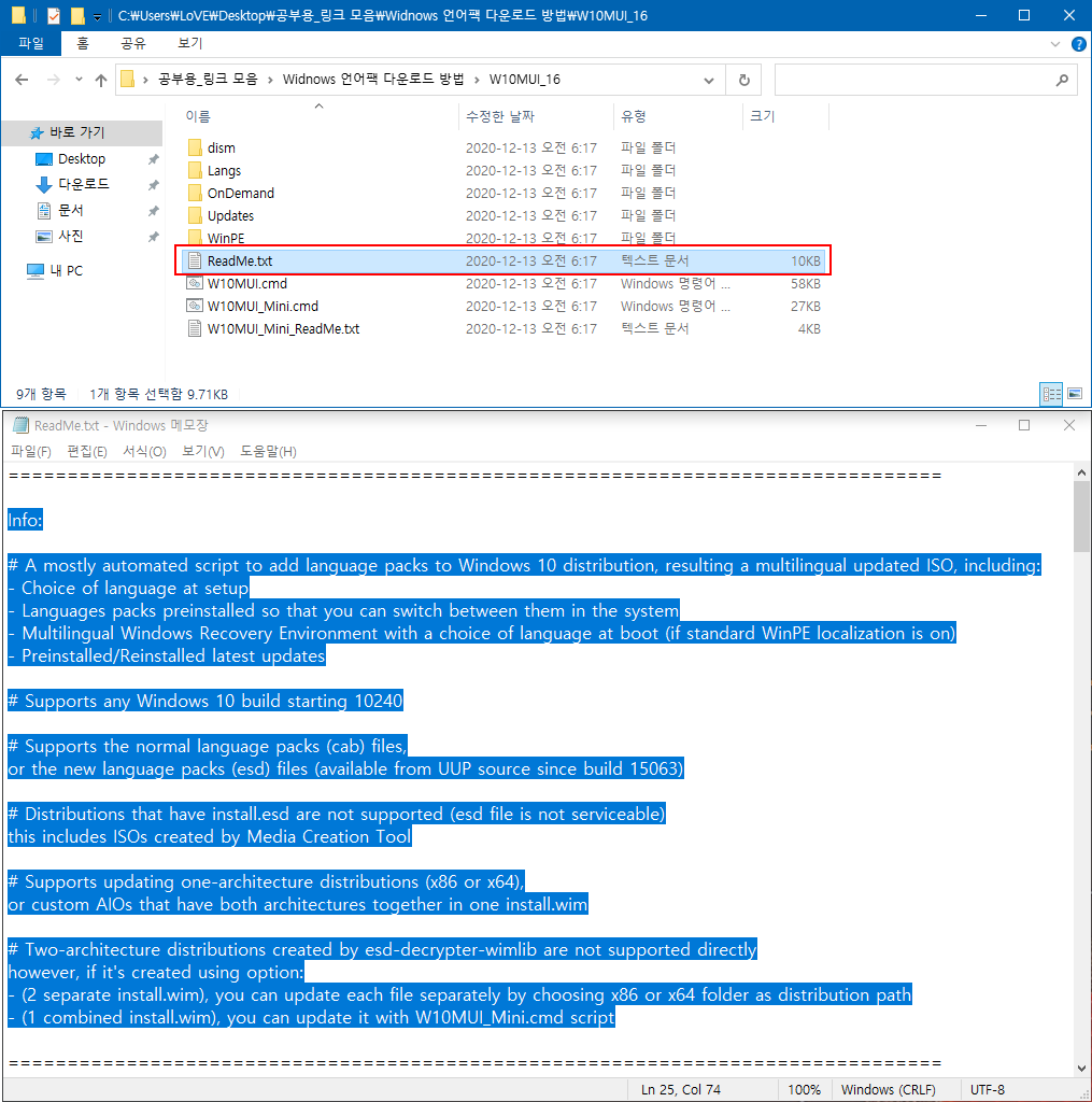 - (1개의 결합된 install.wim) W10MUI_Mini.cmd 스크립트로 업데이트할 수 있음.