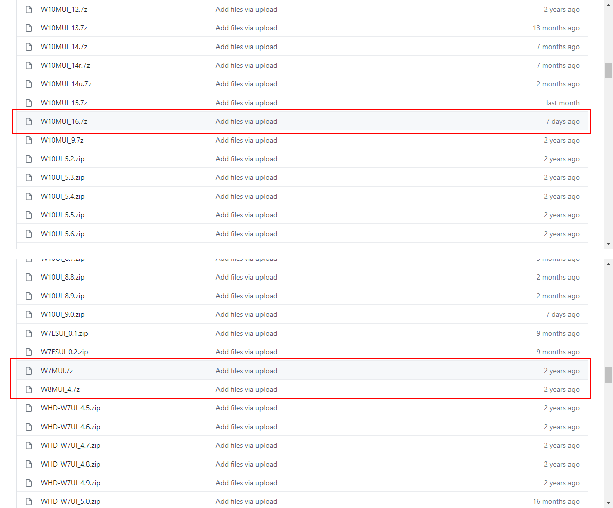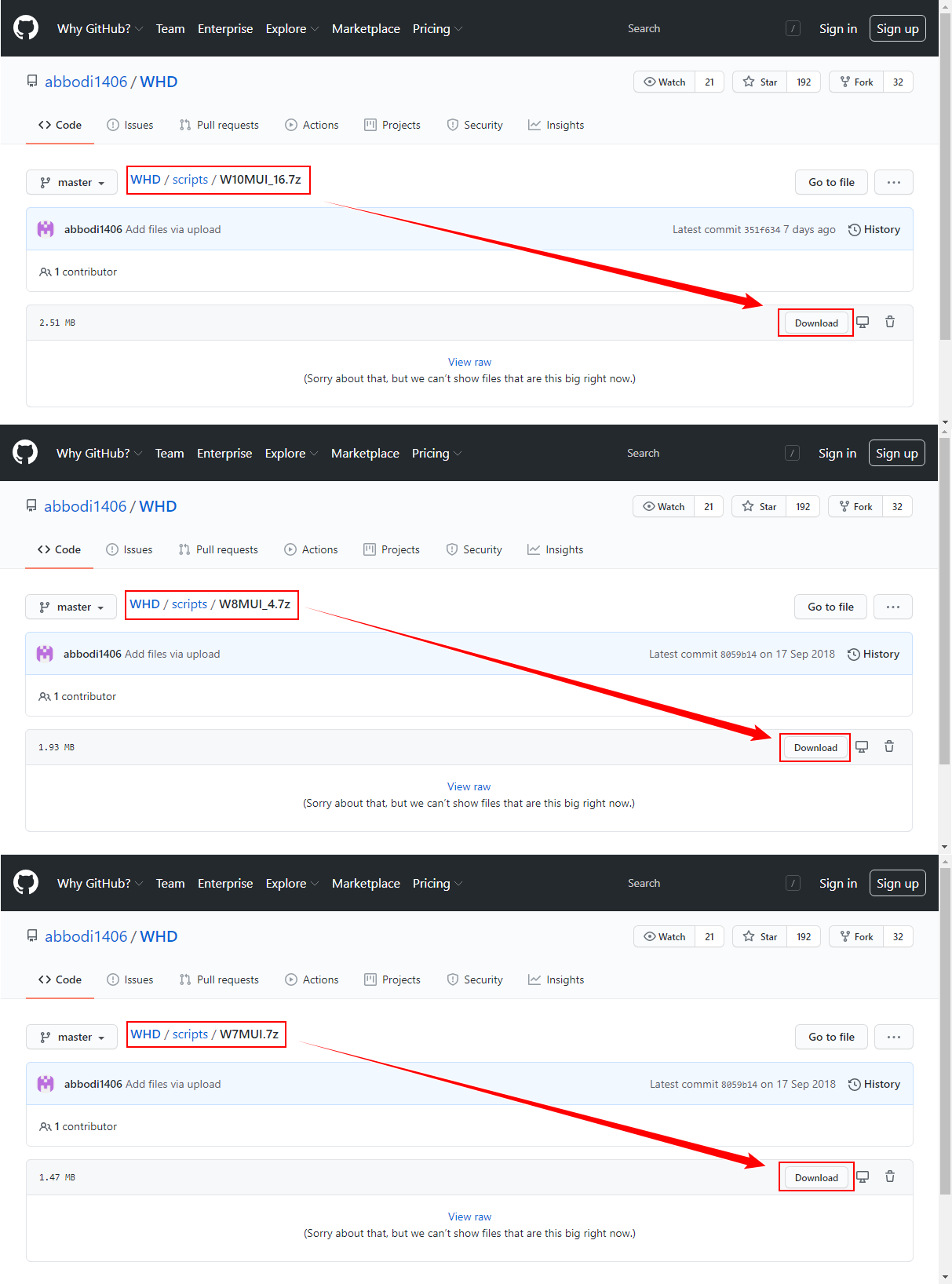 위 링크로 접속한 다음, 'WHD 프로젝트 → Scrips 폴더'를 선택합니다. 그 다음 여러가지 목록 중 최신 버전의 'W10MUI / W8MUI / W7MUI' 버전을 찾아 다운로드합니다.