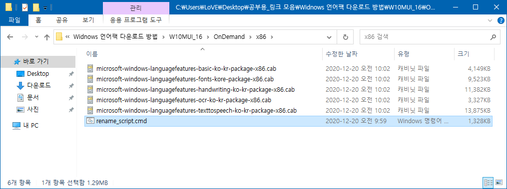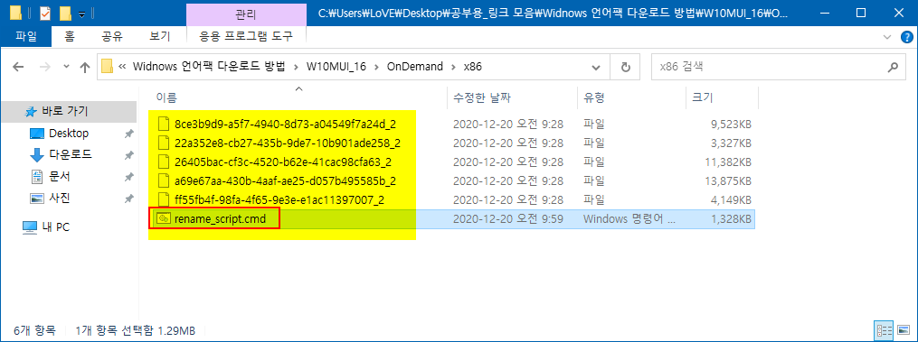 다운로드한 'rename_script.cmd' 배치파일을 언어팩이 다운로드된 폴더로 복사한 다음, 더블클릭하여 실행하면 알아서 파일명을 변경합니다. 만약, 다운로드한 언어팩과 버전이 맞지않으면 아무것도 변경되지 않습니다.