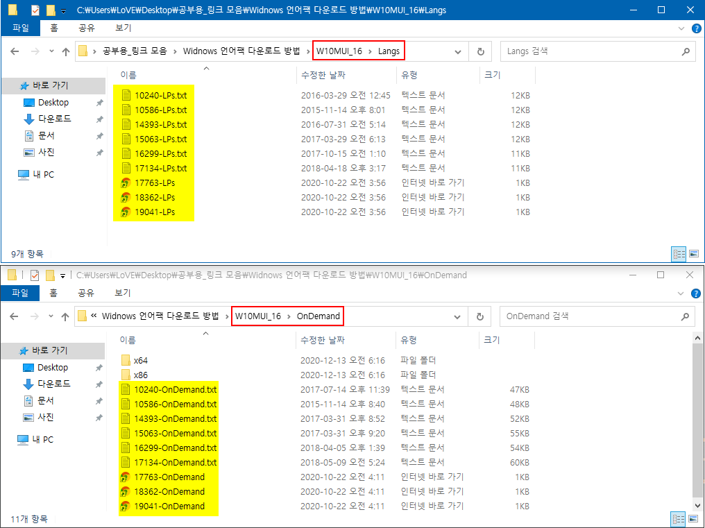 - Widnows 10 UI 언어팩 'Langs'폴더와 언어 기능팩 폴더 'Ondemand'에서 필요한 언어팩을 다운로드합니다.