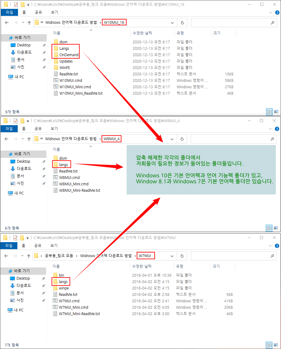 무사히 다운로드를 완료했으면, 원하는 폴더에 'W10MUI / W8MUI / W7MUI' 압축파일들을 압축 해제합니다. 압축 해제한 각각의 폴더 구성을 살펴 보겠습니다.