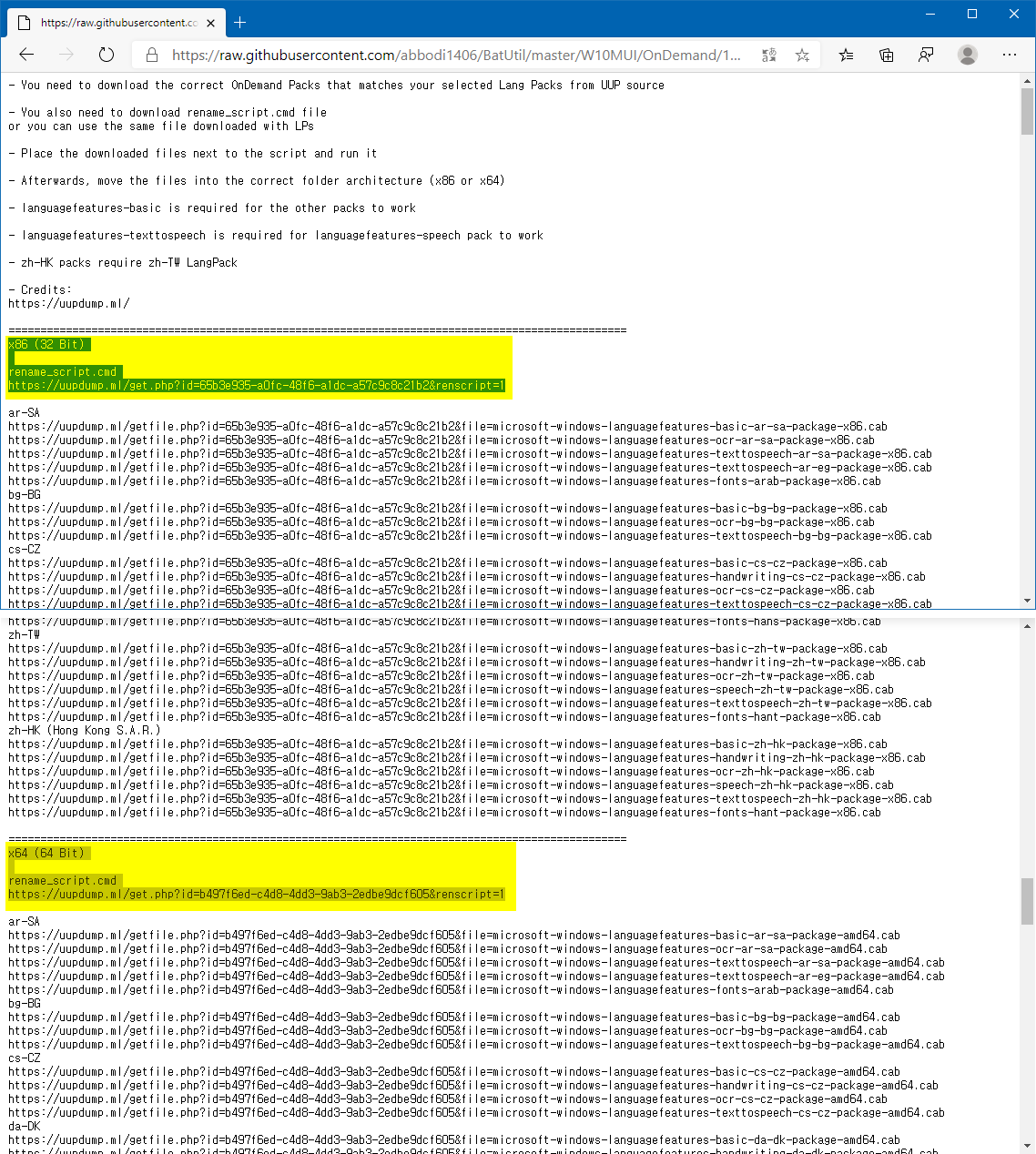대강 다운로드한 스크립트 자료가 무엇인지 파악했으니 언어팩들을 다운로드하겠습니다. 제작자 스크립트는 Windows 배포 이미지에 언어팩 또는 업데이트팩을 통합하는 툴입니다. 그래서 저희들은 툴을 직접적으로 사용하지않고 필요한 언어팩 다운로드 링크 주소만 찾으면 됩니다.