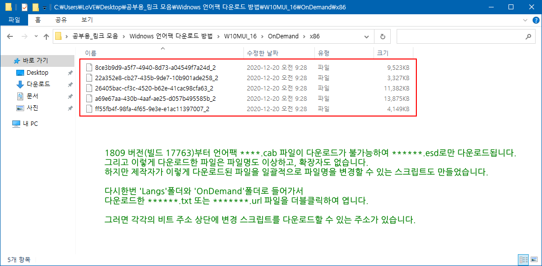 Windows 10 1809(빌드 17763) 버전부터 이렇게 다운로드한 언어팩 및 언어 기능팩은 파일명이 이상하고, 확장자도 없습니다. 수동으로 본인이 다운로드 주소를 참고하여 *******.cab 형식으로 변경하여 사용하면 됩니다. 이 부분이 귀찮으면 밑에 '다운로드한 언어팩 파일들 일괄 파일명 변경하기' 부분을 참고하시면 됩니다.