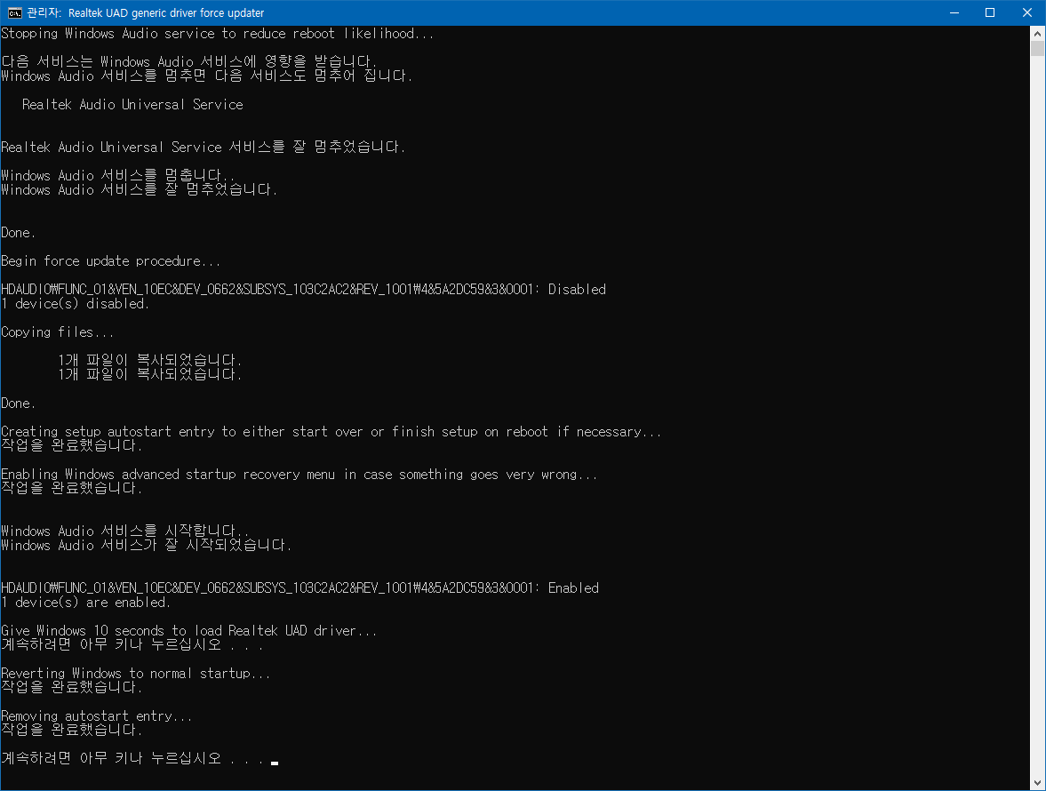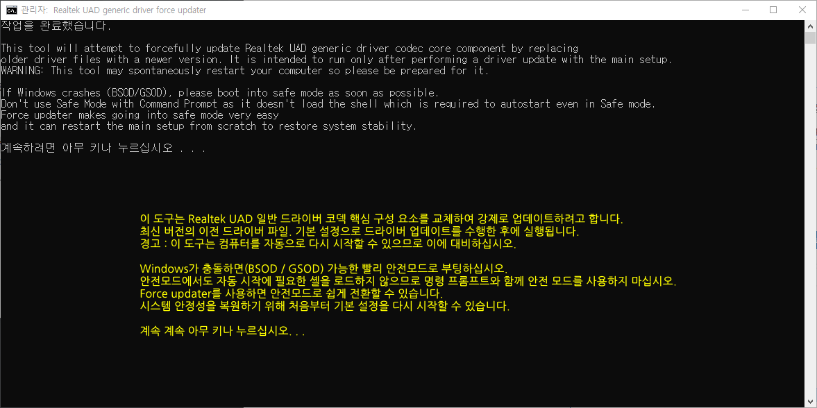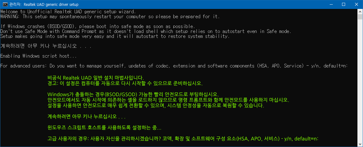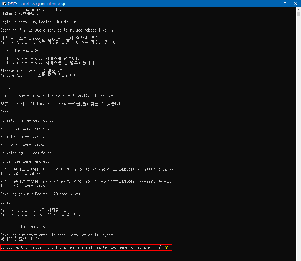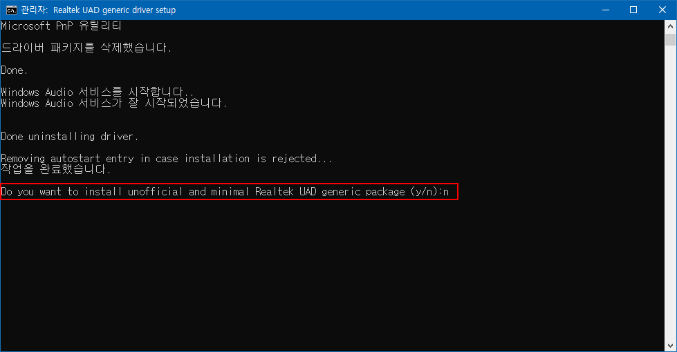 - 'Do you want to install unofficial and minimal Realtek UAD generic package (y/n):' 에서 'N'를 입력하여 명령프롬프트를 종료하여 삭제를 완료