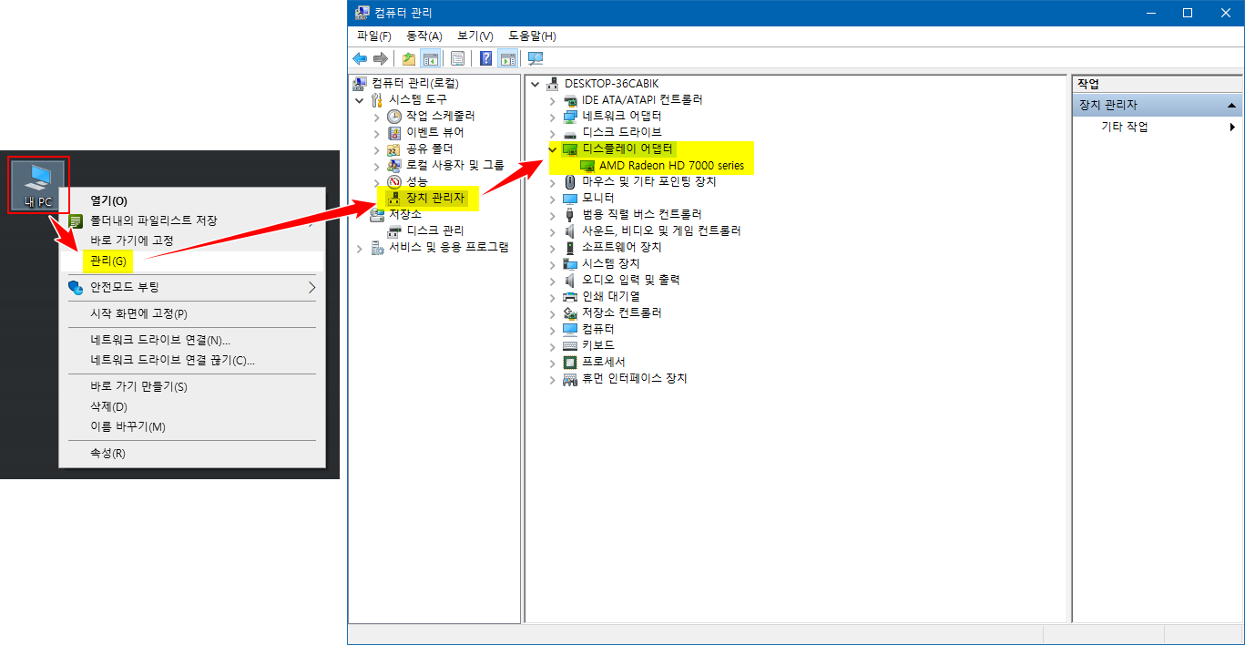 - 바탕화면 '내 PC' 아이콘을 마우스 오른쪽 버튼으로 클릭하여 '관리' 메뉴를 선택