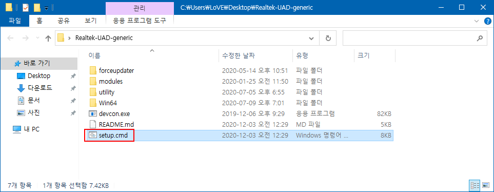 다운로드한 'RealtekAudioControl_*.**.***-offline.zip' 압축 파일을 압축해제한 후, 'Setup.cmd' 배치파일을 더블클릭하여 설치하시면 됩니다.
