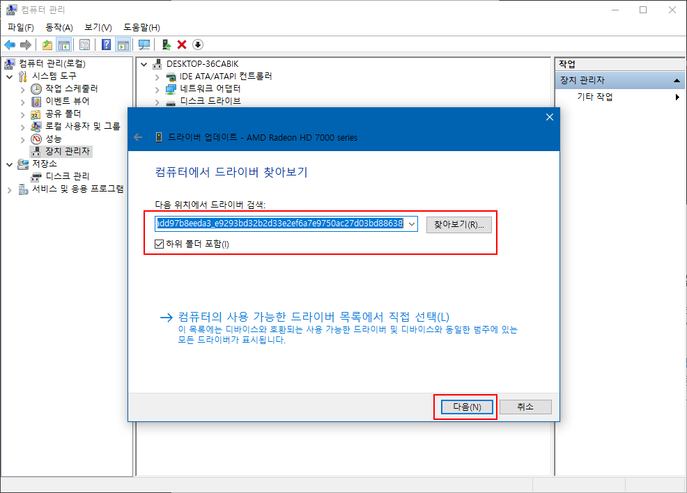 - '찾아보기' 버튼을 클릭하여 압축해제된 폴더를 선택하고, '다음' 버튼을 클릭하여 드라이버 설치를 시작