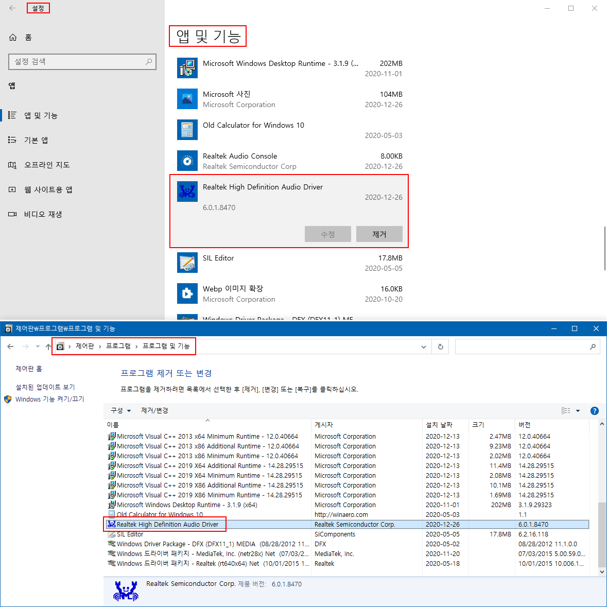 - Windows 10의 경우에는 '설정 → 앱 및 기능 → Realtek High Definition Audio Driver' 클릭 제거