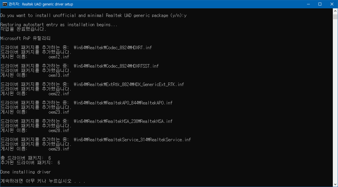 - 'Do you want to install unofficial and minimal Realtek UAD generic package (y/n):' 에서 'Y'를 입력하여 설치를 시작함.