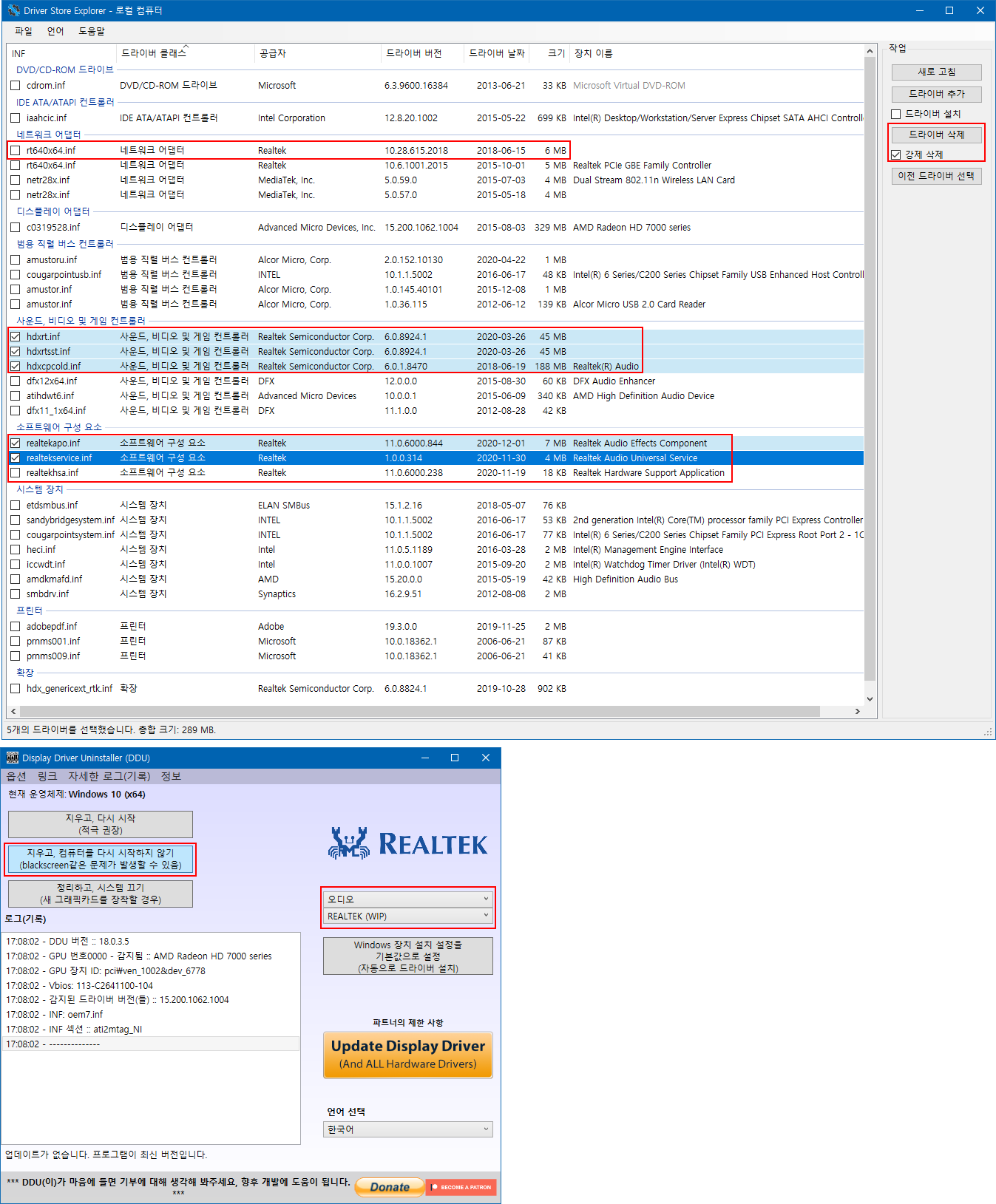 - 'DriverStore Explorer' 또는 'Display Driver Uninstaller(DDU)'로 이전 Realtek 드라이버가 있으면 삭제