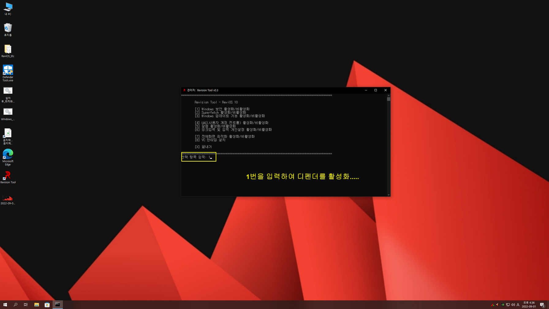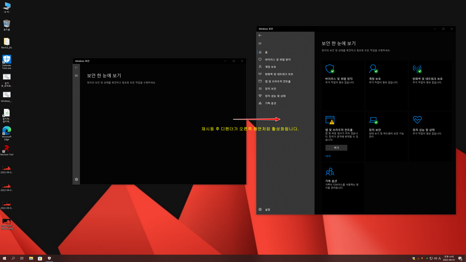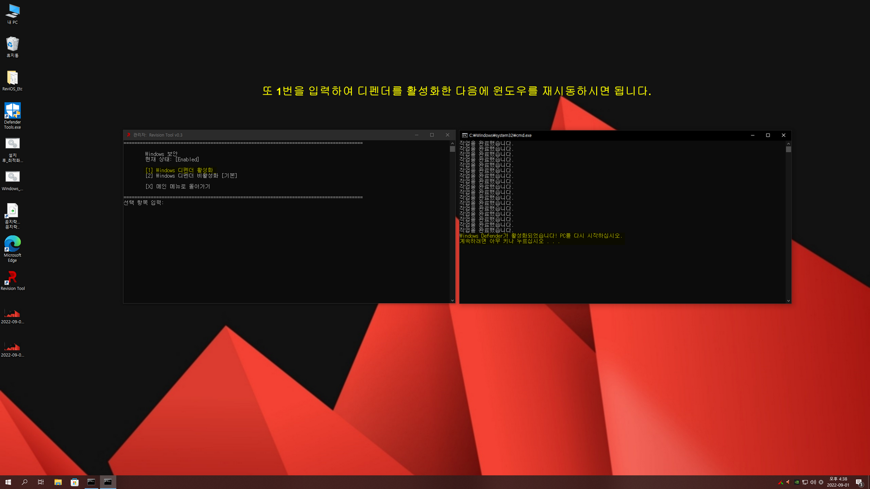 비활성화된 디펜더를 다시 사용하려면 바탕화면에 있는 'Revision Tool' 바로 가기를 실행하여 밑에 캡처 이미지를 참고하여 활성화하면 됩니다. 활성화한 후에는 반드시 재시동하여야 정상적으로 디펜더가 작동합니다.