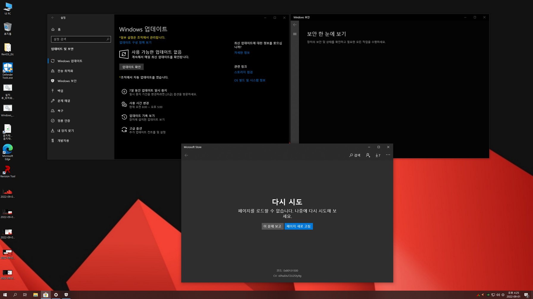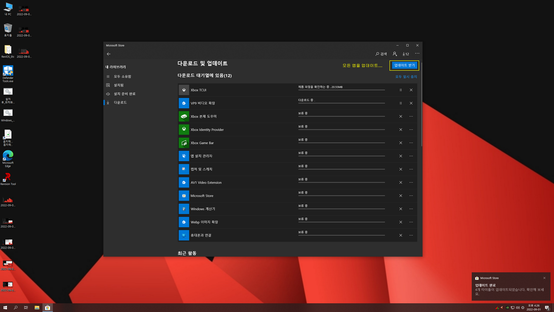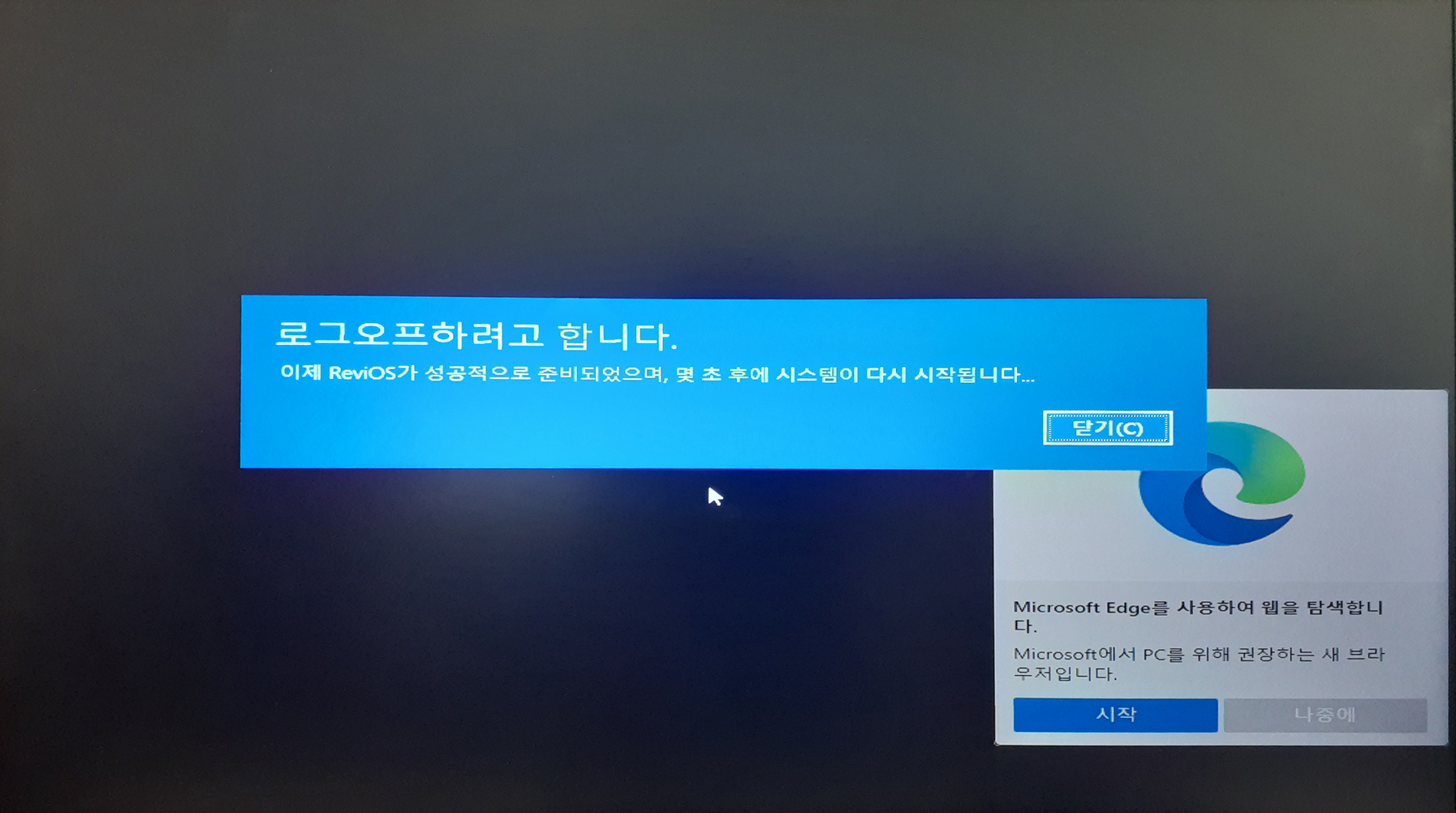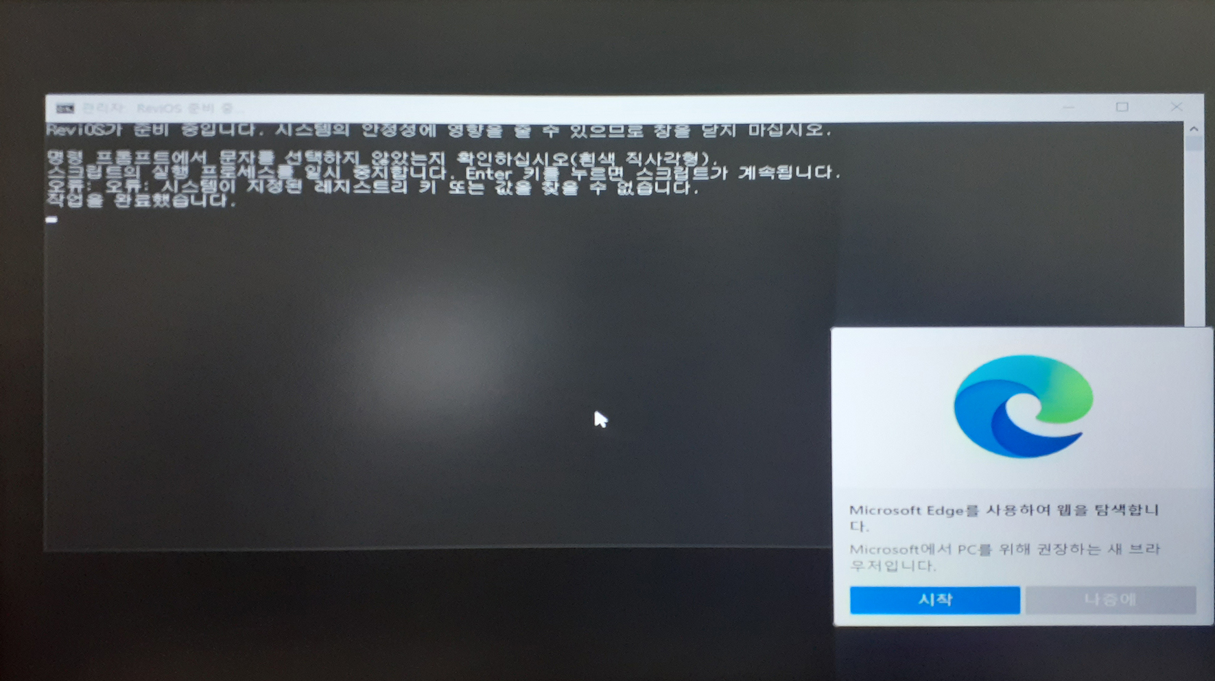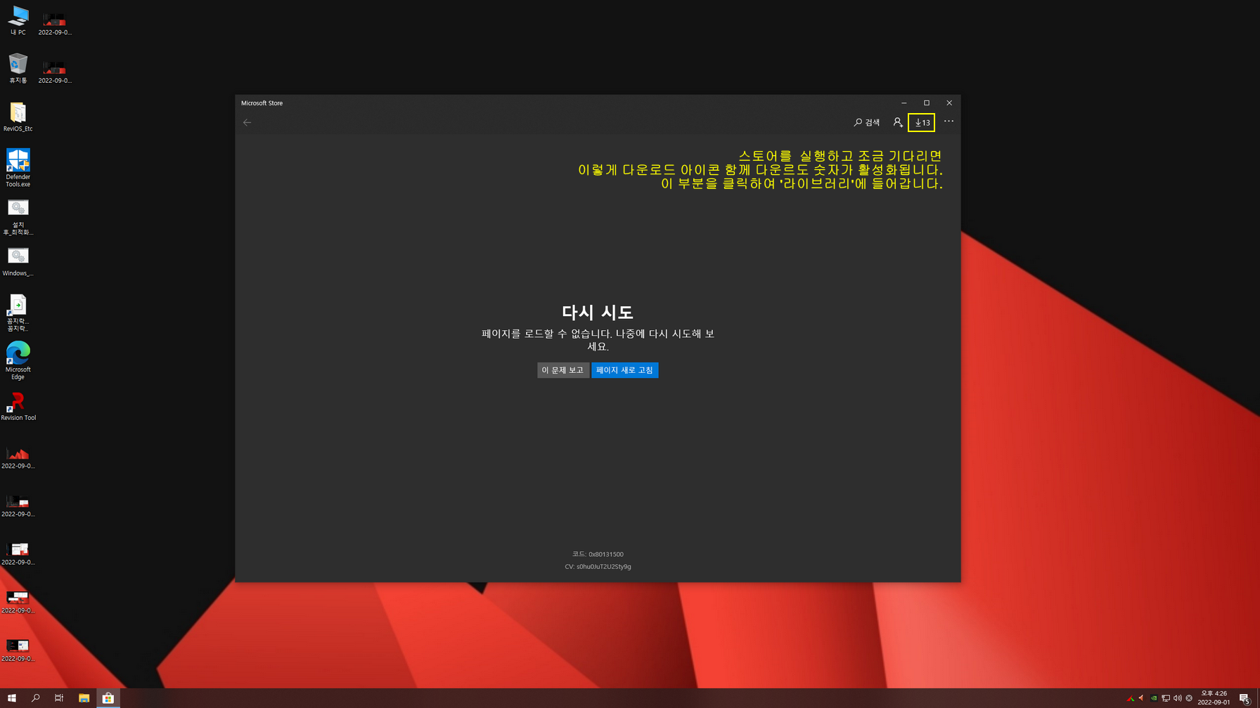 설치는 사용자 계정(오프라인)과 Administrator 계정으로 설치 할 수 있습니다. 첫 부팅 후, 제작자 추가 설정작업이 자동으로 실행되며, 모든 작업이 끝나면 10초 뒤에 재 부팅이 됩니다. 재 부팅후에는 한글화 마무리를 위해 스토어 앱을 실행하여 모든 UWP 앱을 업데이트해 줍니다. 처음 스토어 앱을 실행하면 아래 캡처 이미지처럼 에러가 나옵닙니다. 그래도 실행된 상태로 조금 기다리면 오른쪽 상단에 다운로드 숫자와 함께 아이콘이 활성화되니, 다운로드 아이콘을 클릭하여 '내 라이브러리'에 진입하여 업데이트해 주시면 앱들의 한국어가 적용됩니다.