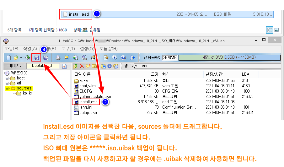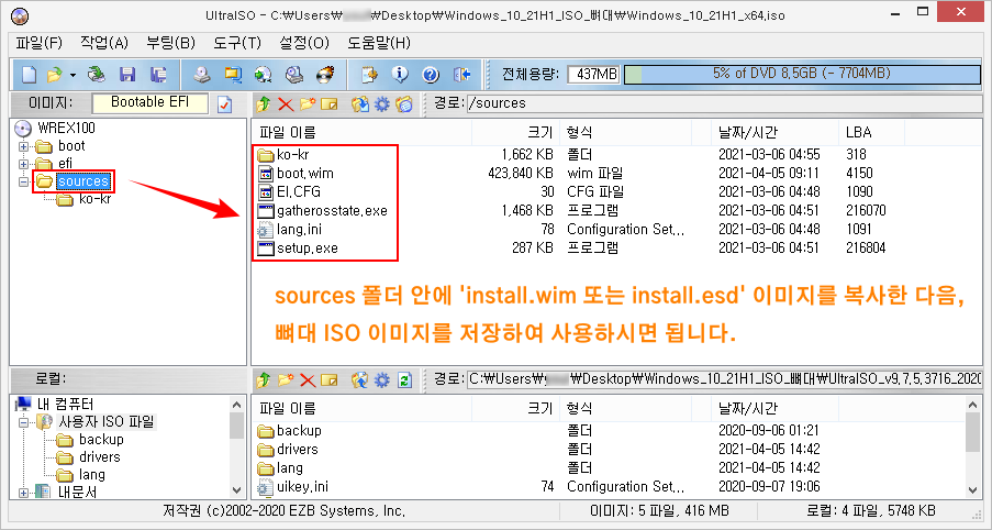 - 'sources' 폴더 안에 'install.esd(또는 install.wim)' 이미지를 드래그하여 복사합니다.