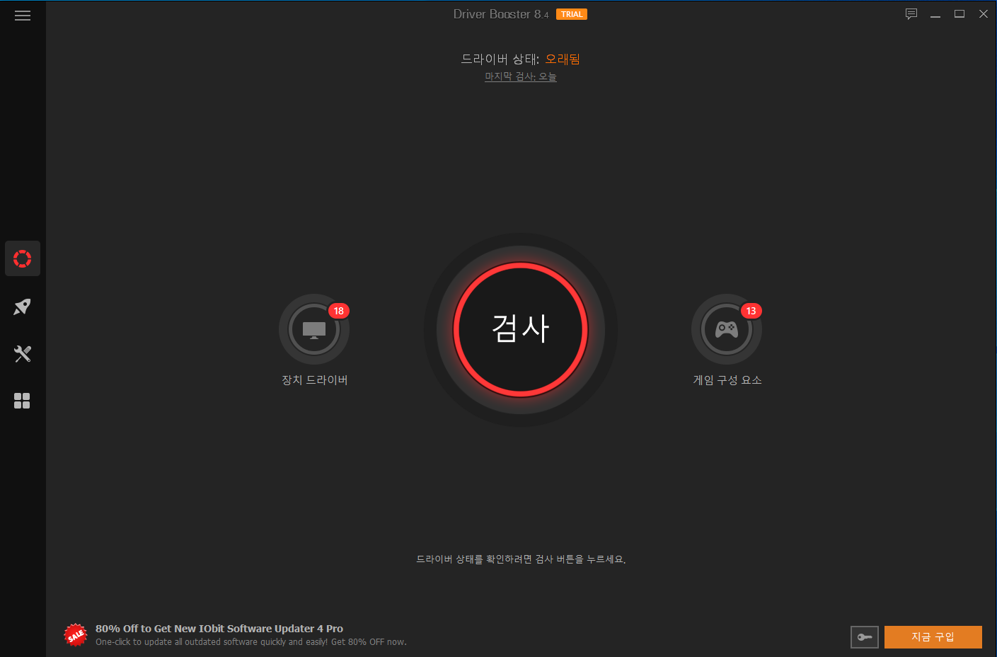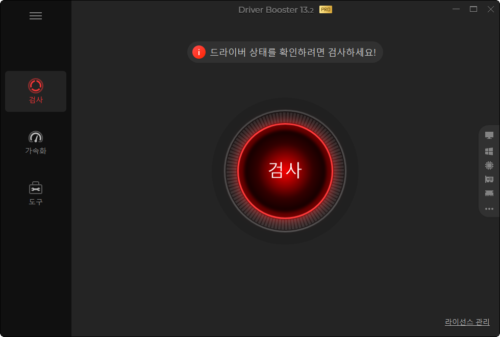 Driver Booster 프로그램 실행한 후, '검사' 버튼을 클릭하면 드라이버 검색을 시작합니다.