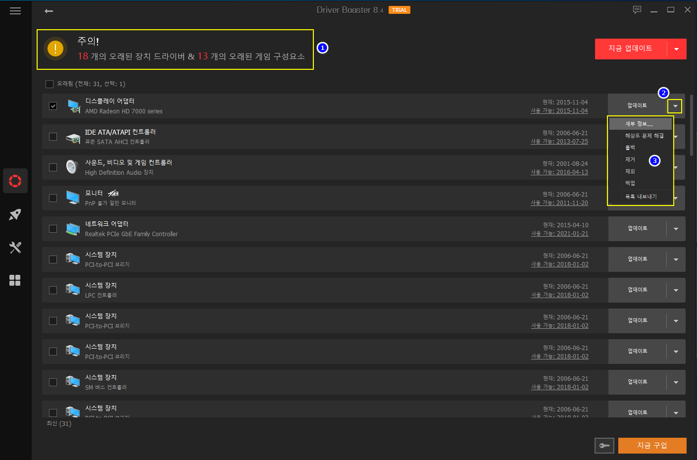 - 검사가 완료되면 화면 상단에는 감지된 오래된 드라이버 수와 게임 구성요소가 표시됩니다. 오른쪽 상단에 있는 '지금 업데이트' 버튼을 클릭하면 검색된 모든 드라이버가 업데이트됩니다.