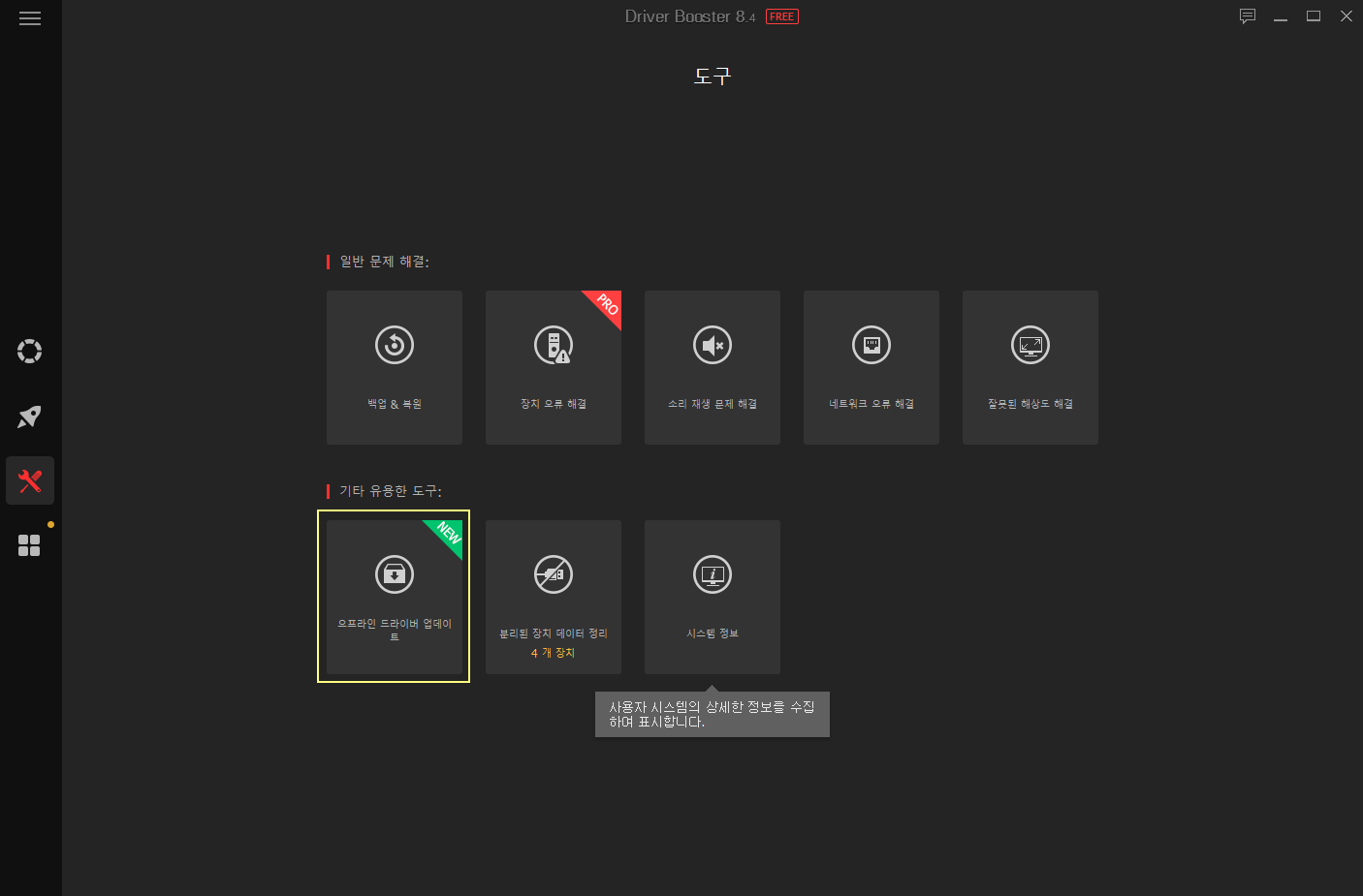 | 도구 | • 소리 재생 문제 • 네트워크 오류 문제 • 잘못된 해상도 해결 • 장치 오류 해결(Pro 기능) • 제거된 장치 데이터 정리 • 시스템 정보 보기 • 오프라인 드라이버 업데이트(Pro 기능) • 드라이버 백업 및 복원(Pro 기능) |