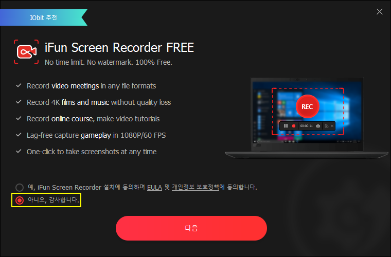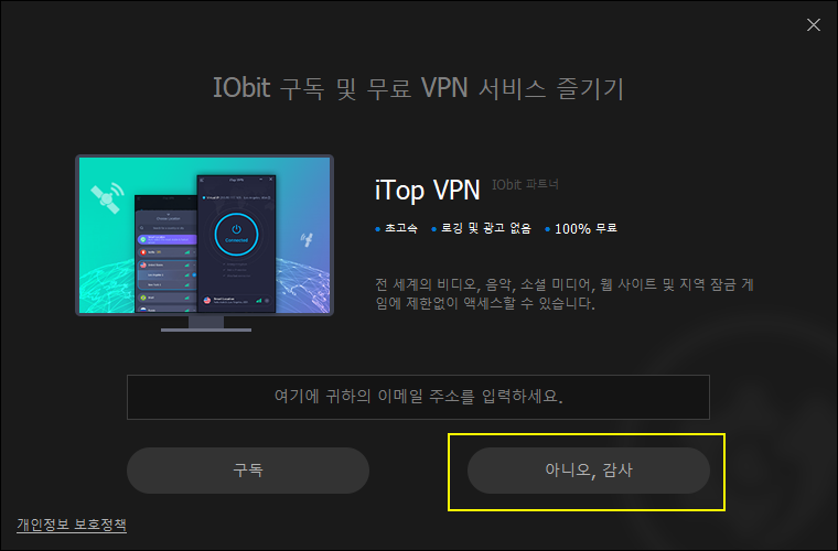 - 설치 완료 후 'IObit 구독 및 무료 VPN 서비스 즐기기' 화면에서 '아니요, 감사' 버튼을 클릭