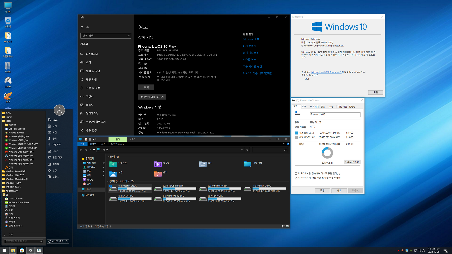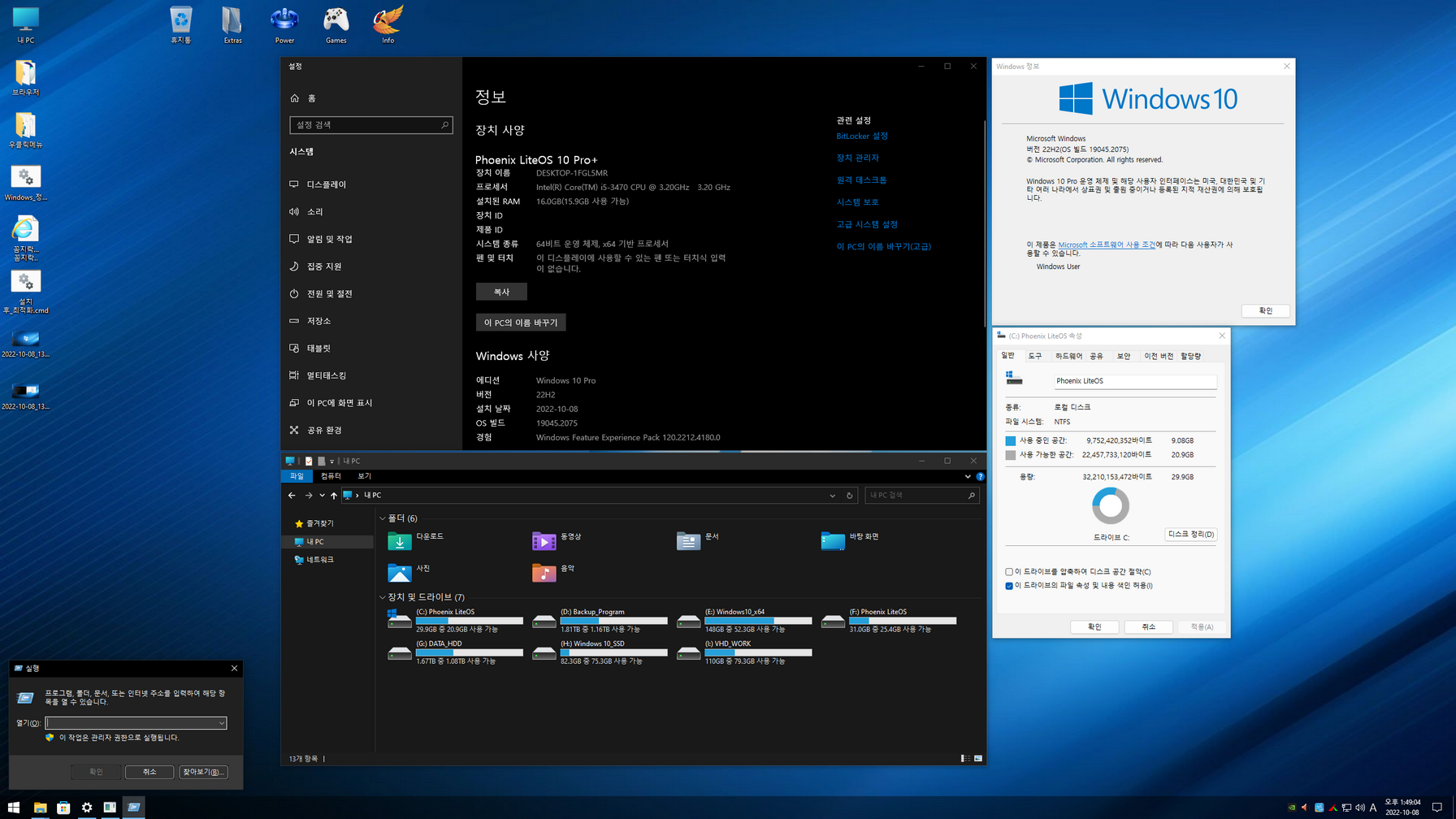 FBConan님 Phoenix LiteOS 10 Pro(Windows 10 Pro 22H2) 지역화 버전이며, 설치 시 컴팩트(Compact)압축으로 설치되는 윈도우입니다.