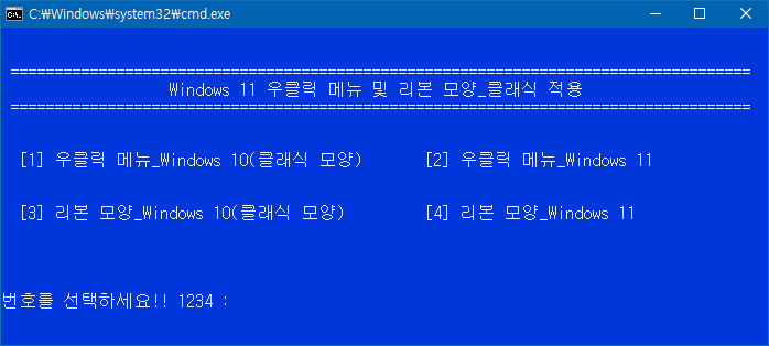 다운로드한 배치파일을 실행하면 4 가지 메뉴가 있습니다. 원하시는 메뉴를 선택하여 적용하시면 됩니다. 이 배치파일은 순정 윈도우를 기준으로 정리된 배치파일이고, 순정 윈도우가 아닌 트윅된 윈도우에서는 정상적으로 작동이 안될 수 있습니다.