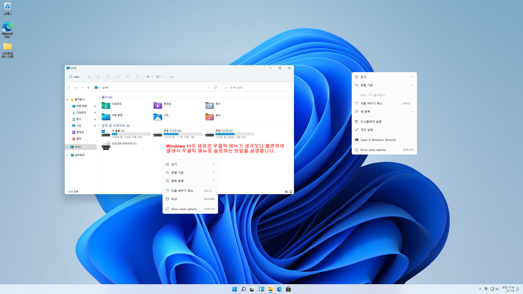 되도록이면 Windows 11에 적응하려고 하는데 우클릭 메뉴가 생각보다 불편하고, 다른 분들도 물어보셔서 후다닥 정리합니다.
