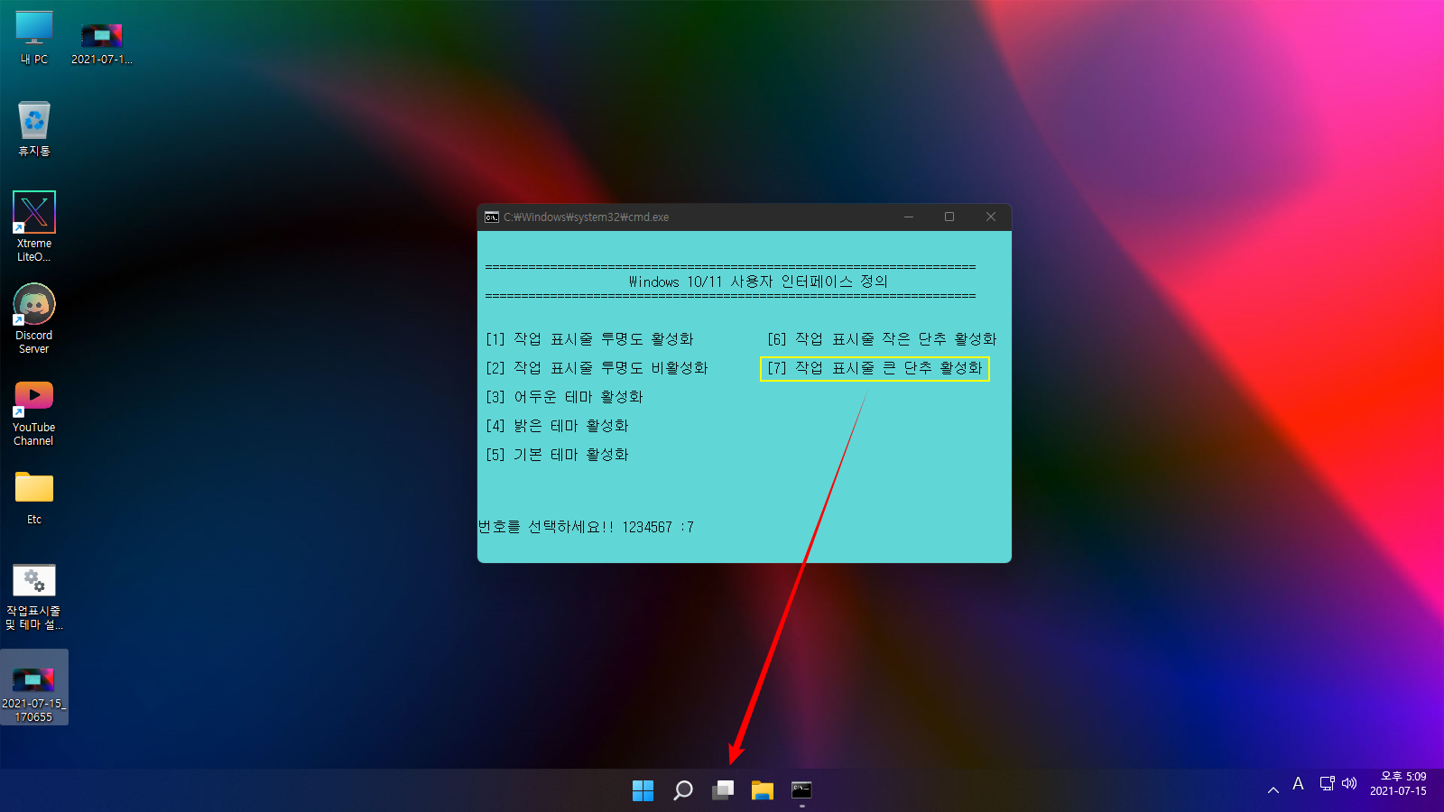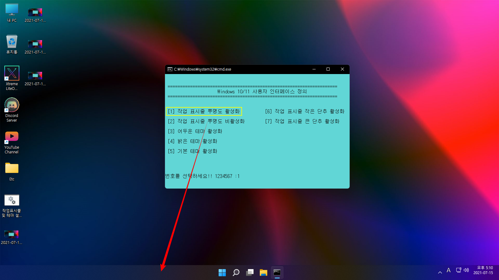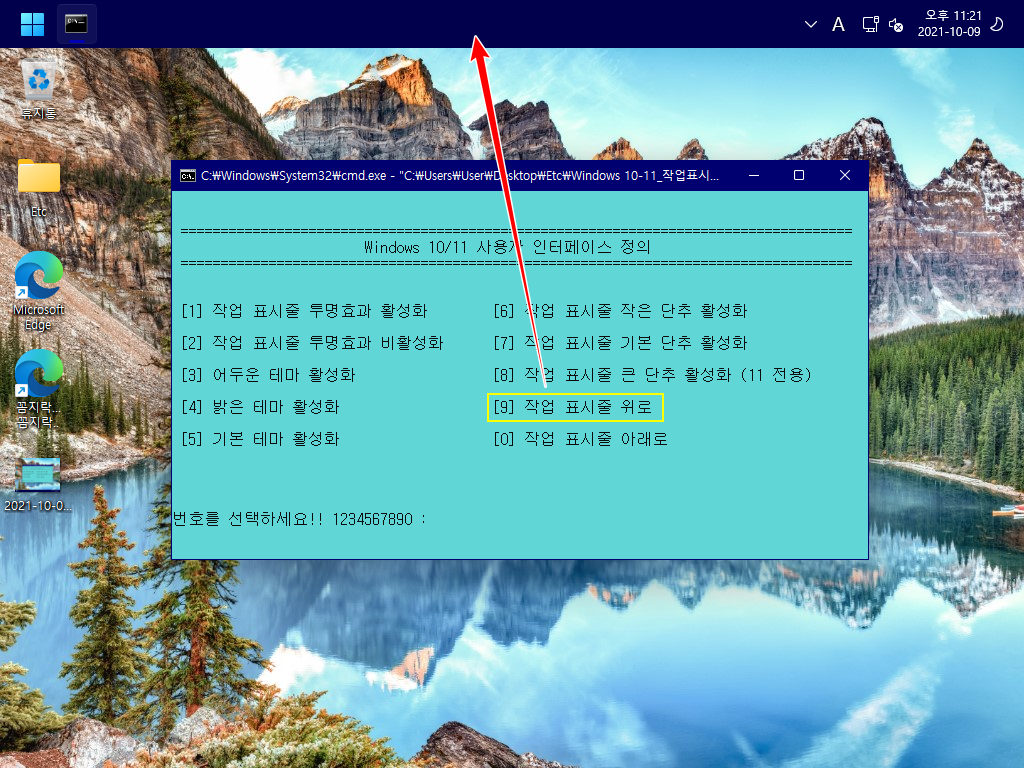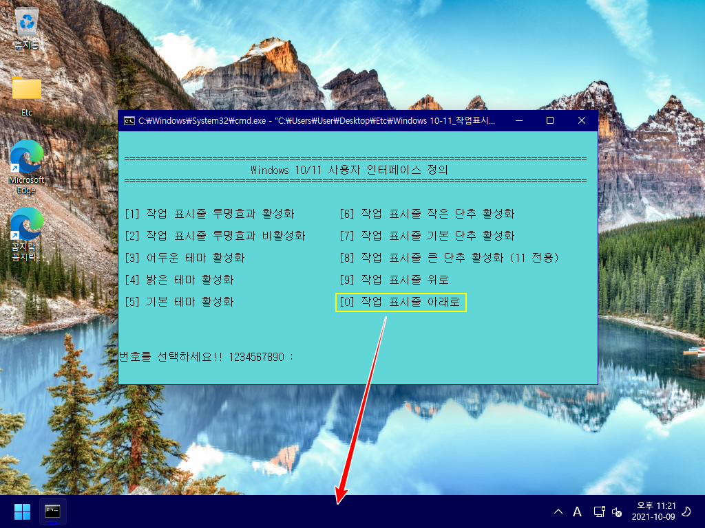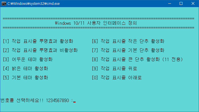 사용법은 다운로드한 '작업표시줄 및 테마 설정_한국어.cmd' 또는 '작업표시줄 및 테마 설정_한국어_Black.cmd' 파일을 더블 클릭하여 실행하면, 각각의 항목을 설정할 수 있는 메뉴들이 나옵니다. 적용할 번호를 입력한 다음, 'Enter' 키를 누르시면 자동으로 실행됩니다.