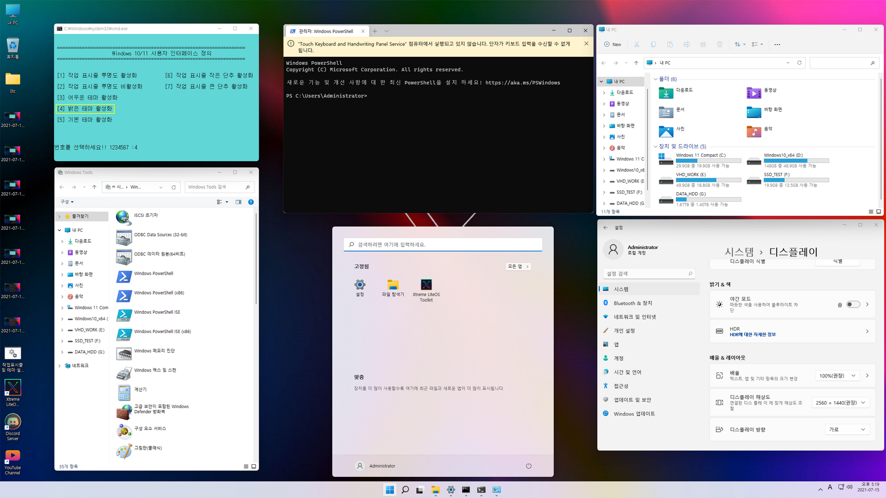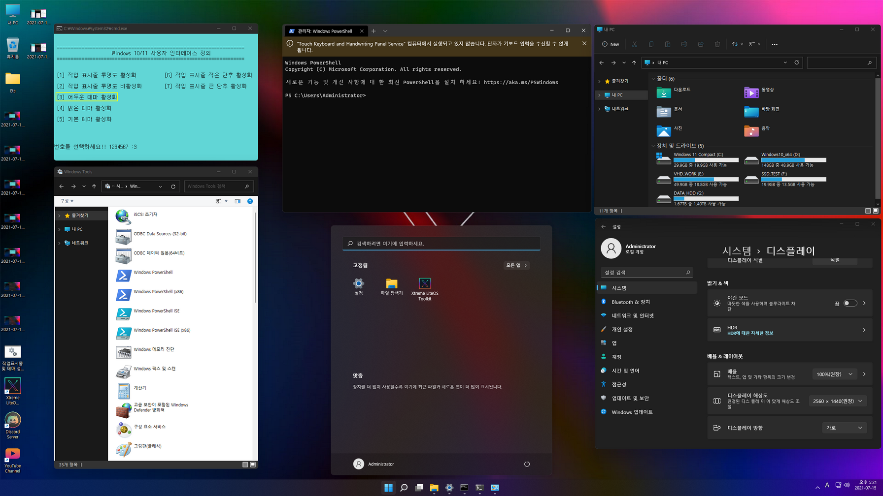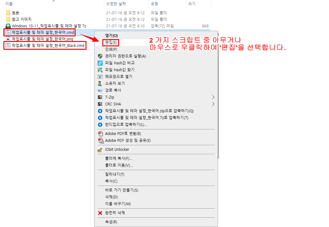 사용법은 다운로드한 '작업표시줄 및 테마 설정_한국어.cmd' 또는 '작업표시줄 및 테마 설정_한국어_Black.cmd' 파일을 더블 클릭하여 실행하면, 각각의 항목을 설정할 수 있는 메뉴들이 나옵니다. 적용할 번호를 입력한 다음, 'Enter' 키를 누르시면 자동으로 실행됩니다.