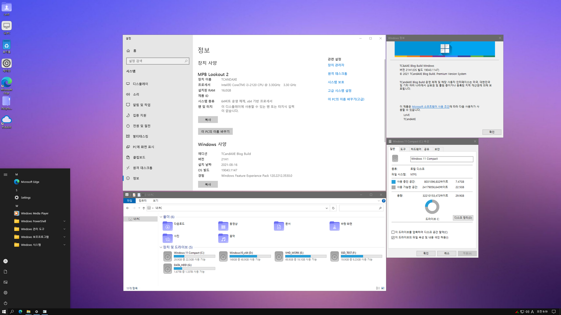Tc&Axe님 트윅 윈도우 4번째 한글화이며, 정상적인 한국어팩 통합이 안되어 머리디밀기로 마무리한 윈도우입니다. 누적 업데이트를 적용하지 못해, 일부 메뉴 중 한국어가 적용이 안되는 부분들이 있습니다.