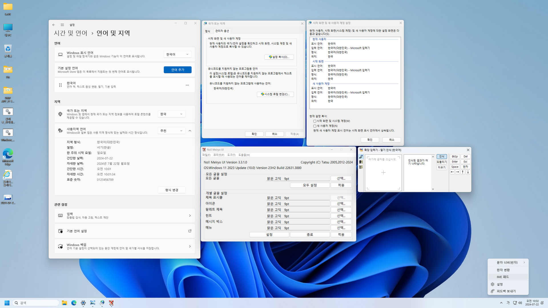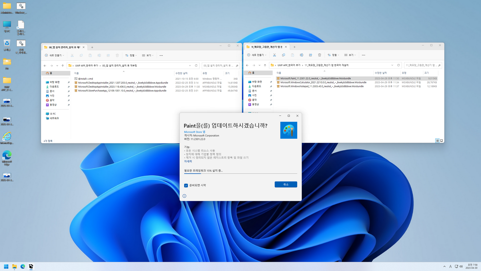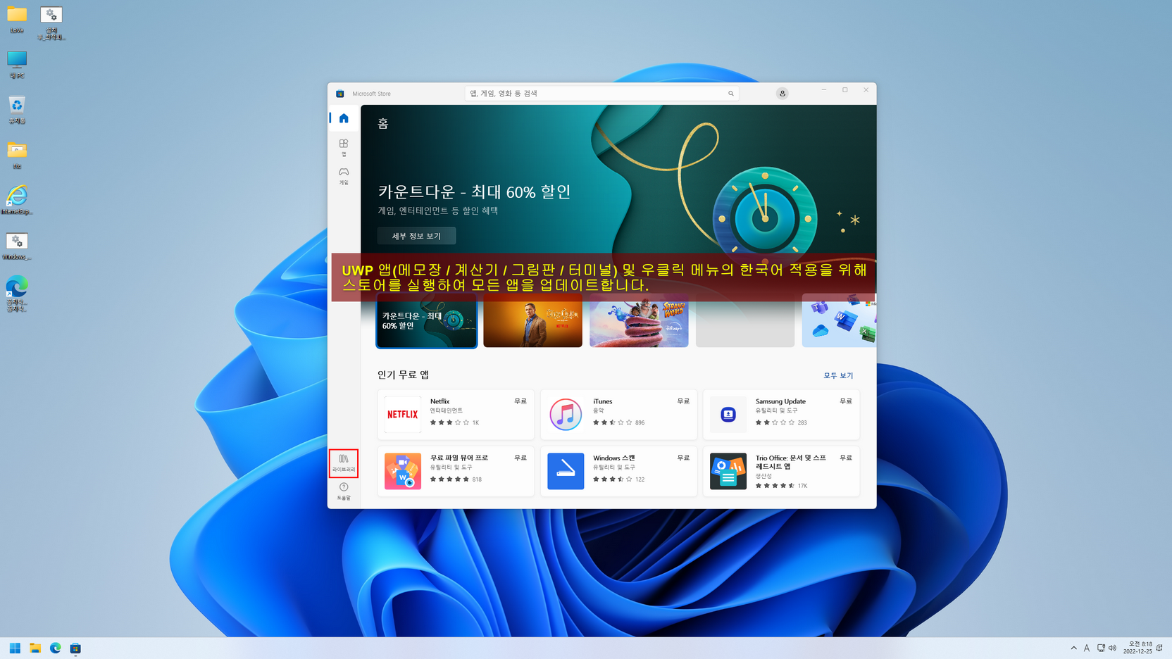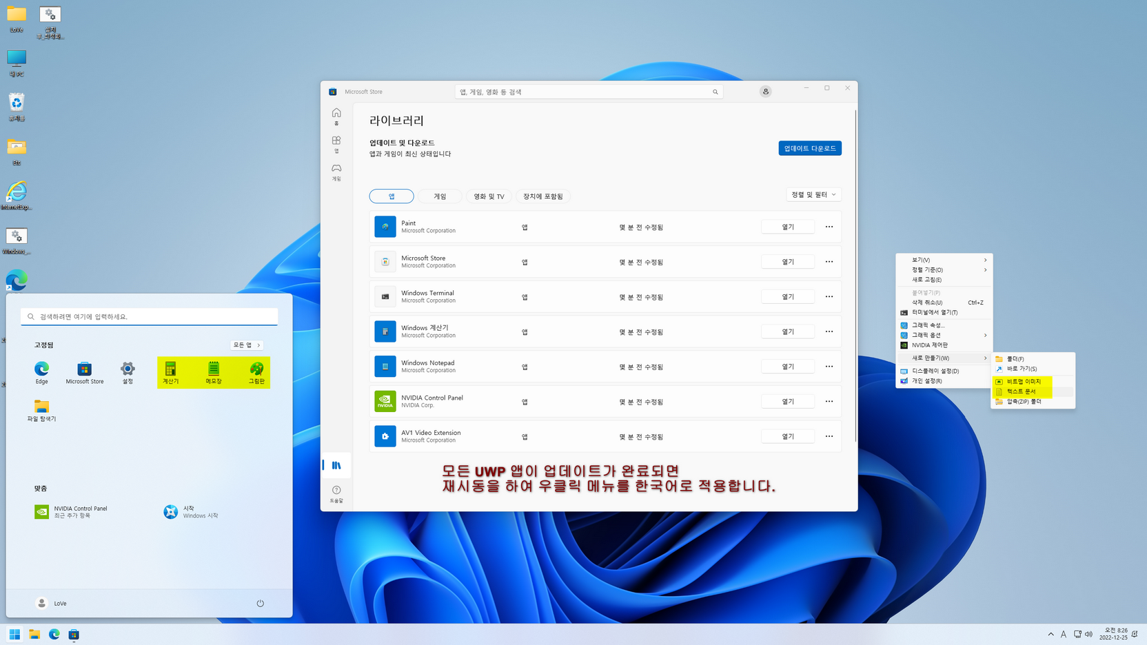 바탕화면에 있는 'Etc' 폴더에 있는 'Misrosoft_Store_설치와 삭제_11용.7z' 압축 파일을 해제한 다음, 스토어를 설치하여 모든 앱을 업데이트하면 한국어가 적용됩니다.