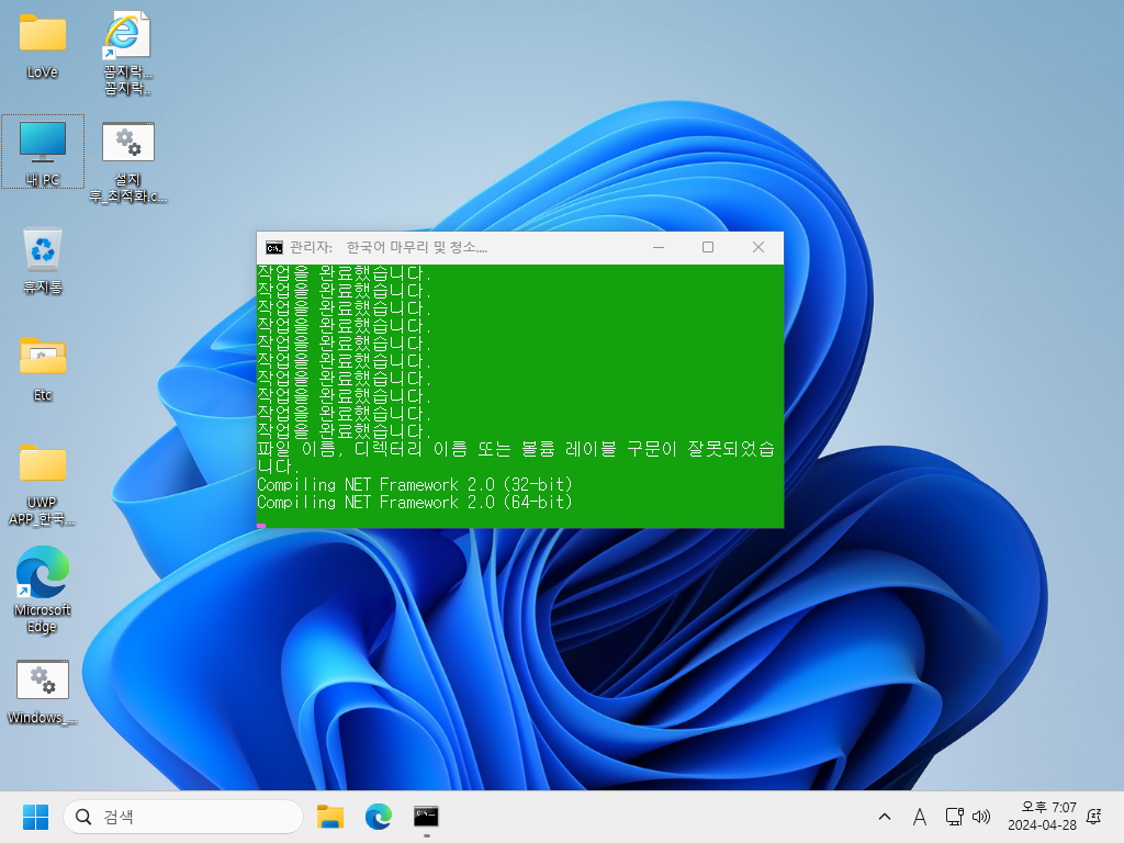 사용자(오프라인, 도메인) 계정으로 설치할 수 있으며, 첫 바탕화면 진입 후에는 한국어 추가 설정과 제작자 배치파일이 실행됩니다. 배치파일 적용은 3~5분정도 시간이 걸리며, 완료 후 재부팅하여 사용하시면 됩니다.