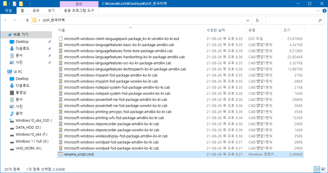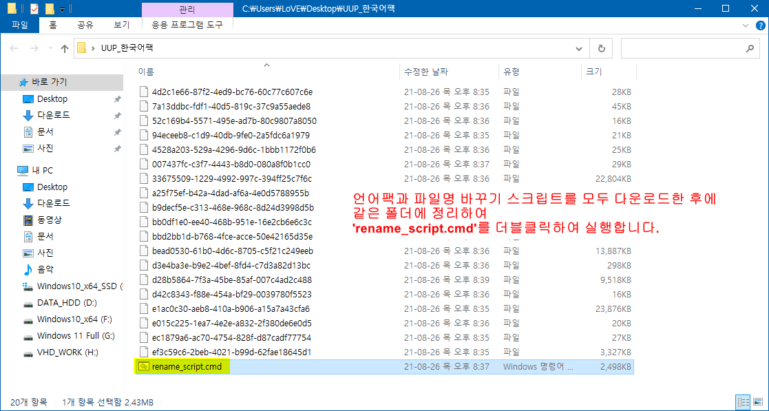 언어팩들과 파일 이름 바꾸기 스크립트의 다운로드가 완료되면, 같은 폴더(위치)에 놓고 'rename_script.cmd' 스크립트 파일을 더블클릭으로 실행하여 목록명으로 파일명을 수정합니다.