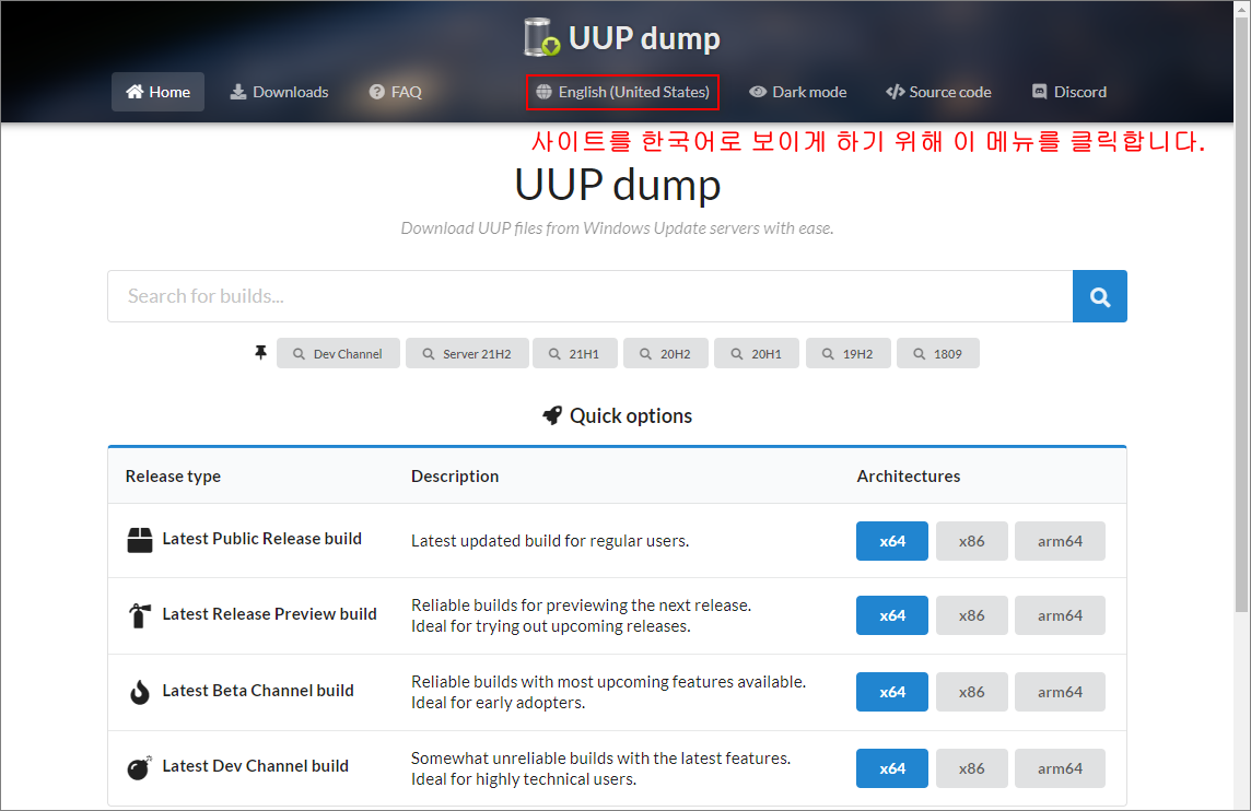 UUP DUMP 사이트에 접속하면 우선 사이트 언어 보기 부분을 한국어로 보이게 합니다. Windows 11부터 32비트 버전은 더 이상 개발하지 않아, AMD64와 ARM64 버전만 있습니다. ARM 아키텍처는 일반적으로 모바일 장치용에 사용되어 저희는 AMD64를 선택하면 됩니다.