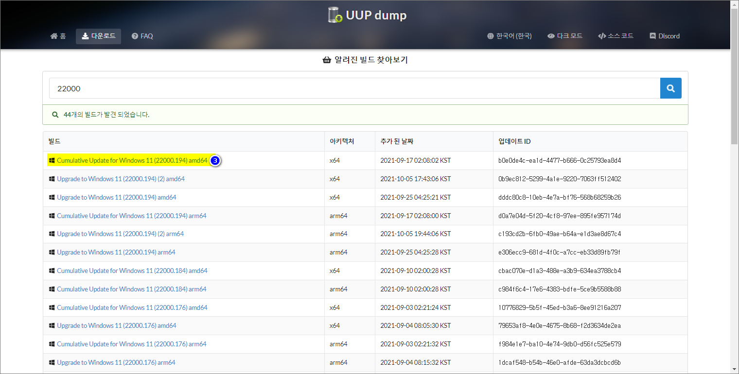 UUP DUMP 홈페이지에서 'Windows 11 21H2'로 빌드 검색하여 목록 부분에서 다운로드할 언어팩관련 윈도우를 선택합니다. AMD64와 관련하여 몇 가지가 보이는데 그 중에 'Cumulative Update for Windows 11 (22000.194) amd64' 빌드를 선택합니다.
