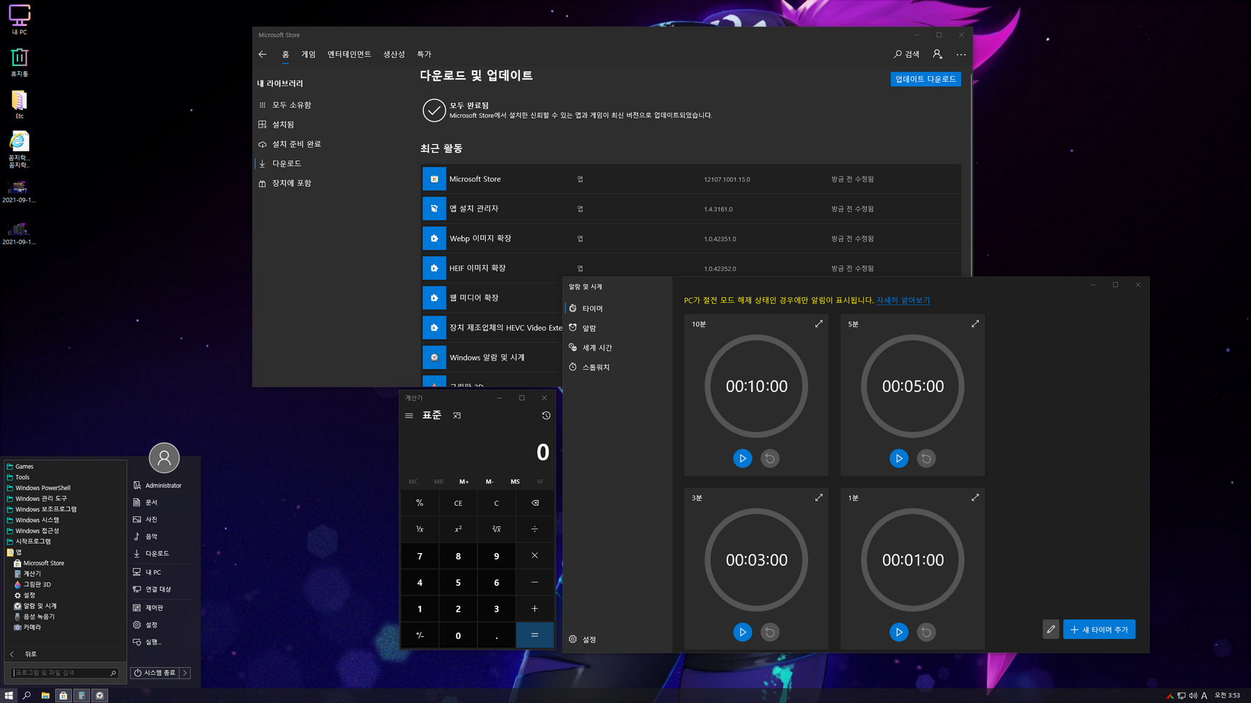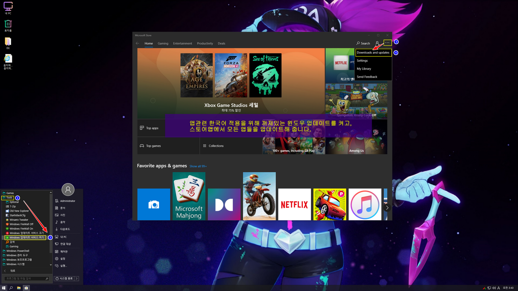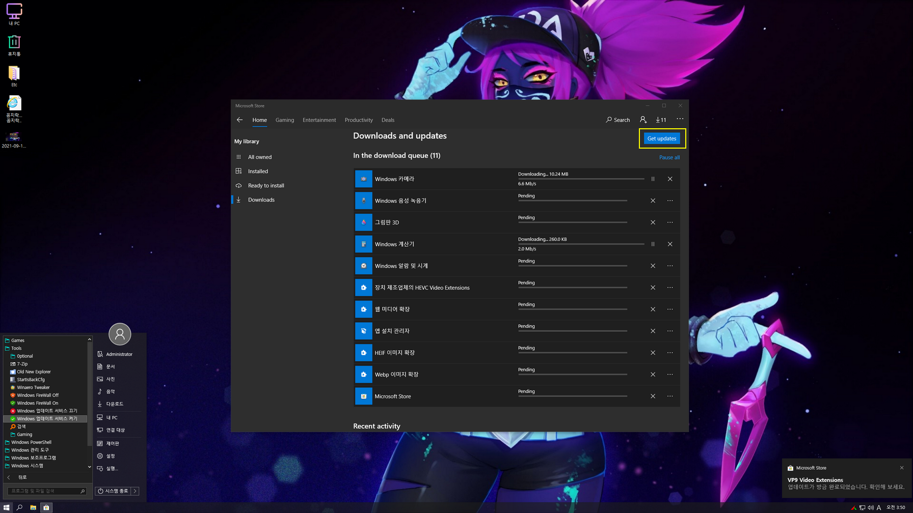 제작자 FBConan 컴팩트 라이트 버전은 WinSXS 폴더가 최적화되어 있고, 설치 시 Compact 압축 설정때문에 설치 시간이 조금 걸립니다. 스토어 앱 한국어 적용은 우선 윈도우 업데이트를 활성화한 다음, 설치된 모든 앱을 업데이트해 주시면 한국어가 적용됩니다. 업데이트 활성화는 바탕화면 'Etc' 폴더에 'Windows 업데이트 ON_OFF'로 활성화하여 사용하거나, 제작자 스크립트를 사용하여도 됩니다.