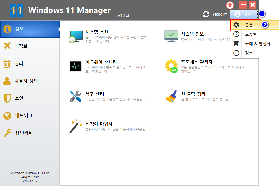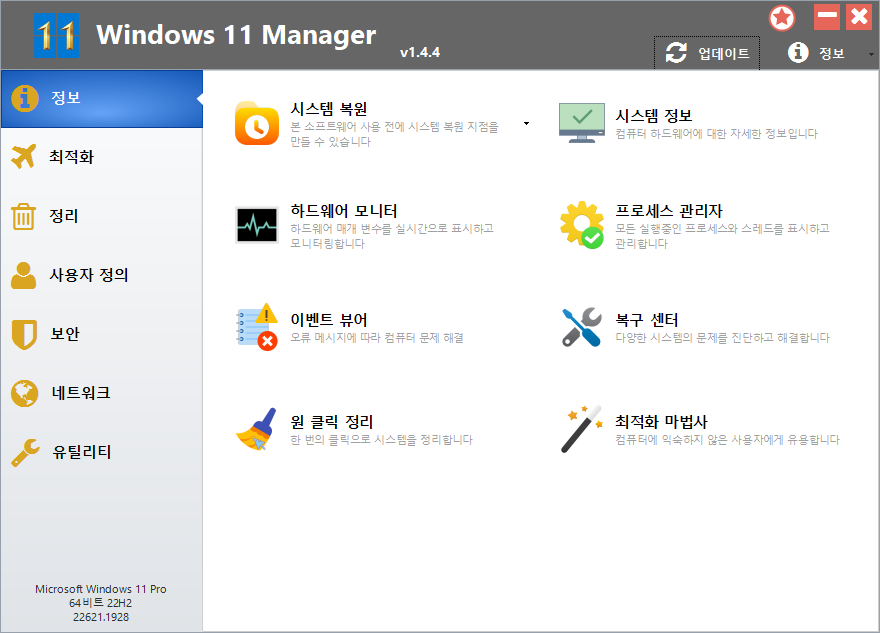 | 정보 | 시스템 복원, 하드웨어 정보 보기, 하드웨어(센서) 모니터링, 실행 중인 프로세스 관리, 시스템 문제 복구, 원 클릭 클리너, 최적화 마법사 |